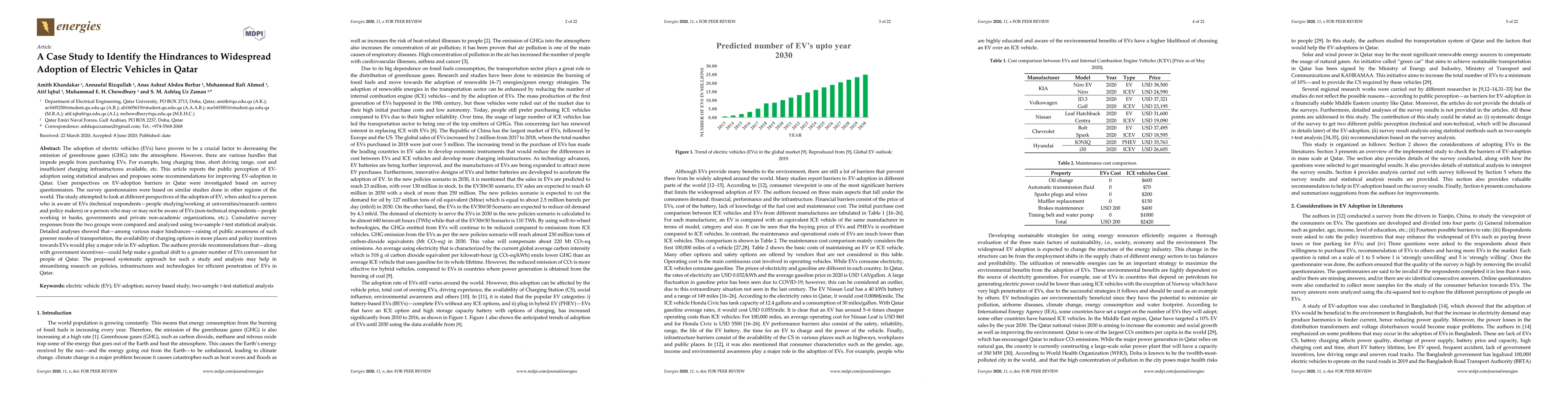A study in Qatar found that public awareness of electric vehicles and availability of charging options were key hindrances to widespread adoption, with policy incentives also playing a major role. Recommendations for increasing EV adoption include government incentives and expanding charging infrastructure.