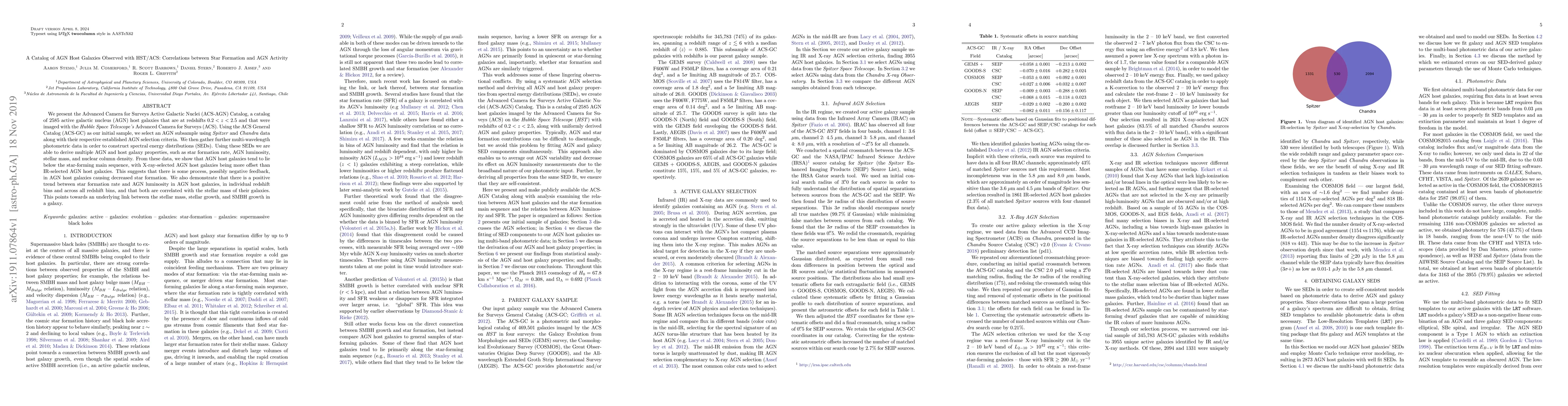 This paper catalogs 2585 AGN host galaxies observed with HST/ACS, revealing correlations between star formation and AGN activity. It finds that AGN host galaxies typically exhibit lower star formation rates, suggesting negative feedback processes, and shows a positive trend between star formation and AGN luminosity, indicating a link between stellar mass and SMBH growth.