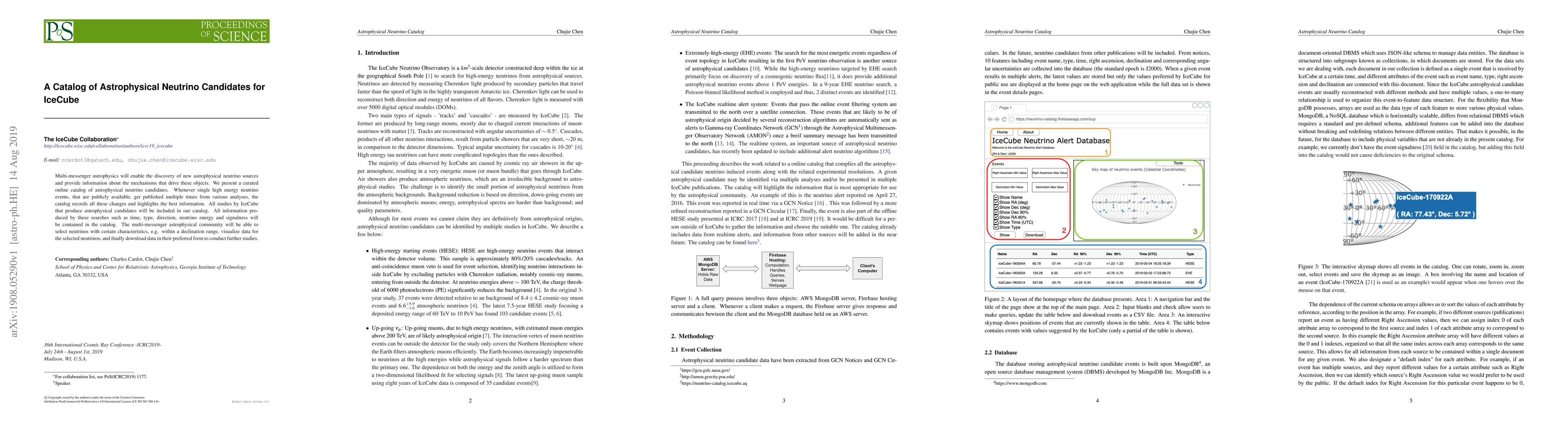 This paper presents an online catalog of astrophysical neutrino candidates from IceCube, designed to track and consolidate multiple analyses of high-energy neutrino events. It aims to facilitate multi-messenger astrophysics research by providing comprehensive data on neutrino events, including time, type, direction, energy, and signalness.