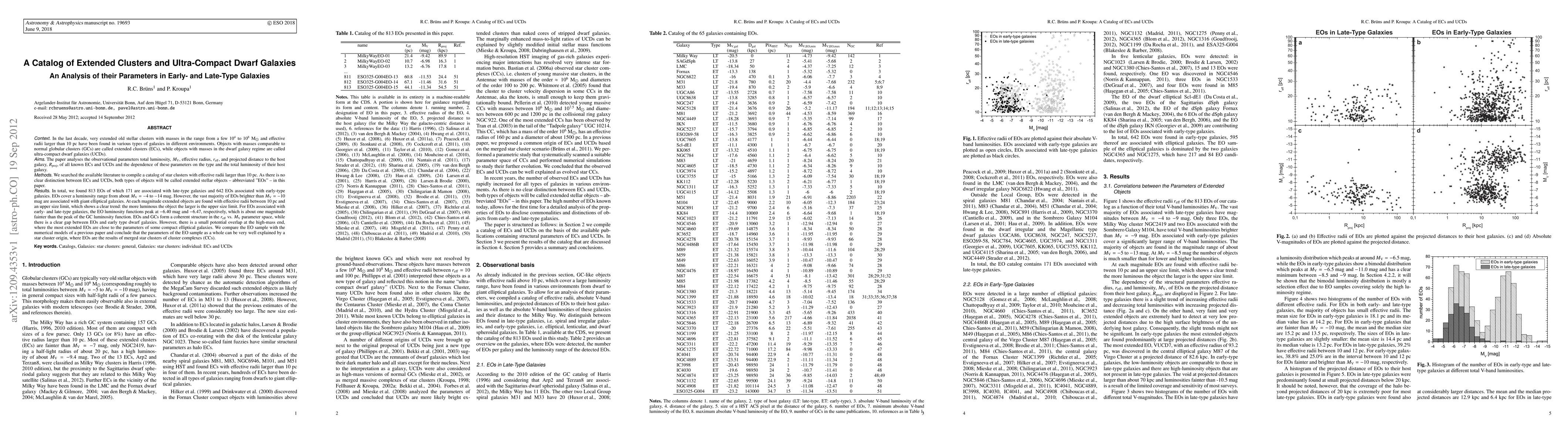 Extended stellar clusters with effective radii larger than 10 pc have been found in various environments. Objects with masses comparable to globular clusters (GCs) are called extended clusters (ECs), while objects with masses in the dwarf galaxy regime are called ultra-compact dwarf galaxies (UCDs). The paper analyses the observational parameters luminosity, effective radius, and projected distance to the host galaxy, of all known ECs and UCDs and the dependence of these parameters on the type and the luminosity of their host galaxy. We searched the available literature to compile a catalog of star clusters larger than 10 pc. As there is no clear distinction between ECs and UCDs, both types of objects will be called extended stellar objects (EOs). In total, we found 813 EOs of which 171 are associated with late-type and 642 with early-type galaxies. EOs cover a luminosity range from about MV = -4 to -14 mag. However, the vast majority of EOs brighter than -10 mag are associated with elliptical galaxies. At each magnitude EOs are found with effective radii between 10 pc and an upper size limit, which shows a clear trend: the more luminous the object the larger is the upper size limit. For EOs associated with early-and late-type galaxies, the luminosity functions peak at -6.40 and -6.47 mag, respectively, which is about one magnitude fainter than the peak of the GC luminosity function. EOs and GCs form a coherent structure in the reff vs. MV parameter space, while there is a clear gap between EOs and early type dwarf galaxies. However, there is a small potential overlap at the high-mass end, where the most extended EOs are close to the parameters of compact elliptical galaxies. We compare the EO sample with numerical models and conclude that the parameters of the EO sample as a whole can be very well explained by a star cluster origin, where EOs are the results of merged cluster complexes.
