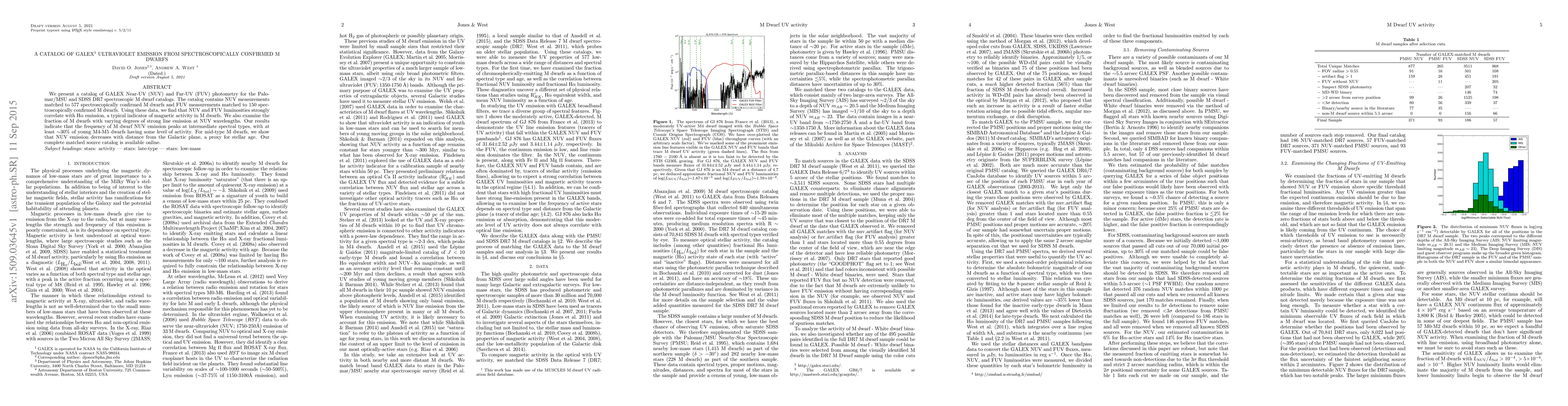 This paper catalogs GALEX ultraviolet photometry for spectroscopically confirmed M dwarfs, finding strong correlations between NUV/FUV luminosities and Hα emission indicative of magnetic activity. The study reveals a peak in NUV emission frequency among young M4-M5 dwarfs and a decrease in NUV emission with increasing distance from the Galactic plane, suggesting a link to stellar age.