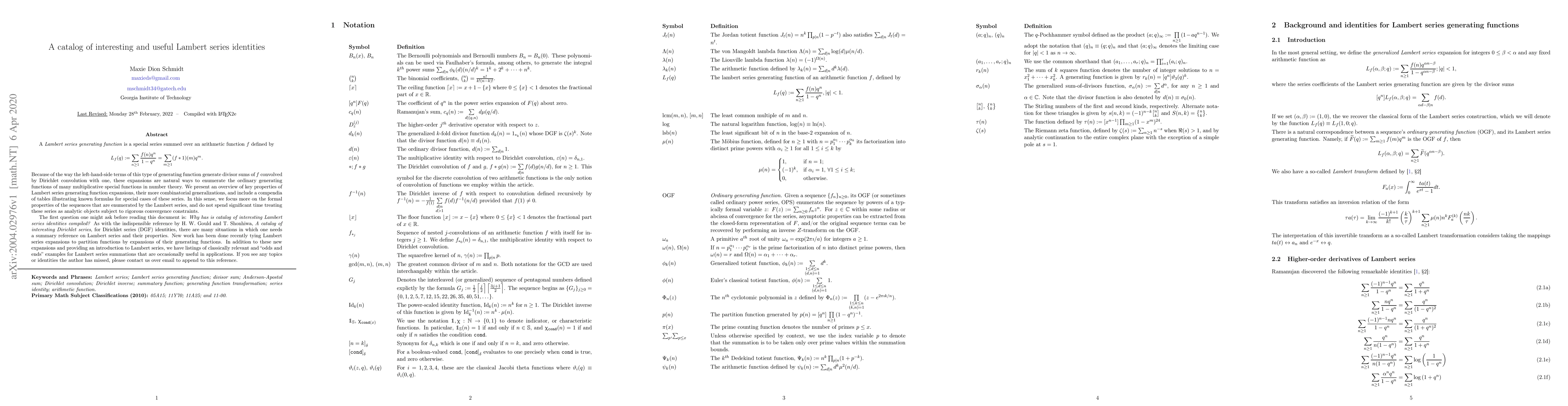 This paper catalogs interesting Lambert series identities, focusing on their formal properties and enumerative aspects. It provides an overview of key properties and combinatorial generalizations, along with tables of known formulas, aiming to serve as a reference similar to Gould and Shonhiwa's catalog for Dirichlet series.