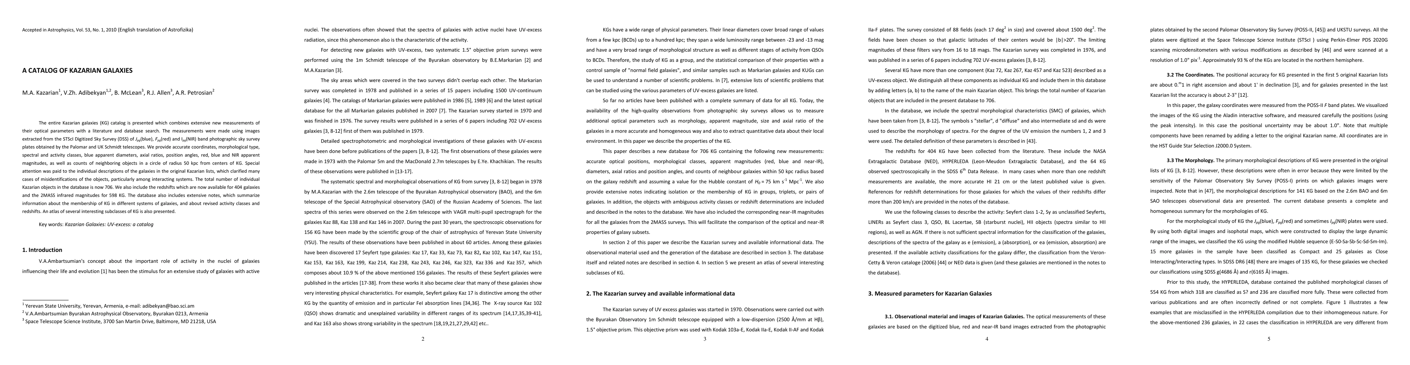 The entire Kazarian galaxies (KG) catalog is presented which combines extensive new measurements of their optical parameters with a literature and database search. The measurements were made using images extracted from the STScI Digitized Sky Survey (DSS) of Jpg(blue), Fpg(red) and Ipg(NIR) band photographic sky survey plates obtained by the Palomar and UK Schmidt telescopes. We provide accurate coordinates, morphological type, spectral and activity classes, blue apparent diameters, axial ratios, position angles, red, blue and NIR apparent magnitudes, as well as counts of neighboring objects in a circle of radius 50 kpc from centers of KG. Special attention was paid to the individual descriptions of the galaxies in the original Kazarian lists, which clarified many cases of misidentifications of the objects, particularly among interacting systems. The total number of individual Kazarian objects in the database is now 706. We also include the redshifts which are now available for 404 galaxies and the 2MASS infrared magnitudes for 598 KG. The database also includes extensive notes, which summarize information about the membership of KG in different systems of galaxies, and about revised activity classes and redshifts. An atlas of several interesting subclasses of KG is also presented.