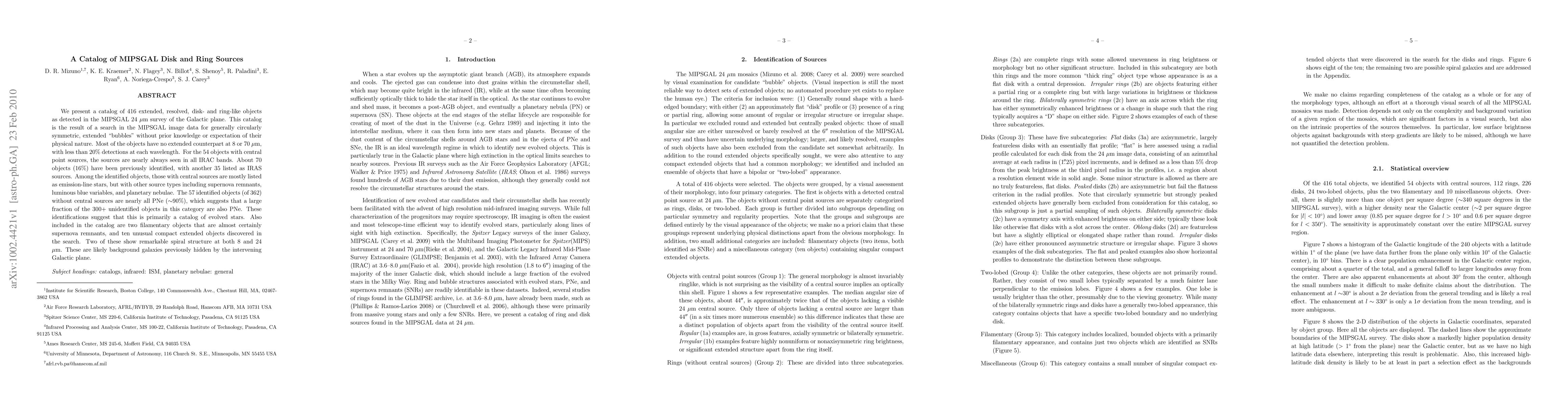 The research presents a catalog of 416 extended, disk- and ring-like objects detected in the MIPSGAL 24 micron Galactic plane survey. Most objects lack counterparts at other wavelengths, suggesting evolved stars. Identified objects include emission-line stars, SNRs, LBVs, PNe, with ~90% of PNe lacking central sources. The catalog also features two filamentary SNRs and ten unusual compact extended objects, two possibly being background galaxies.