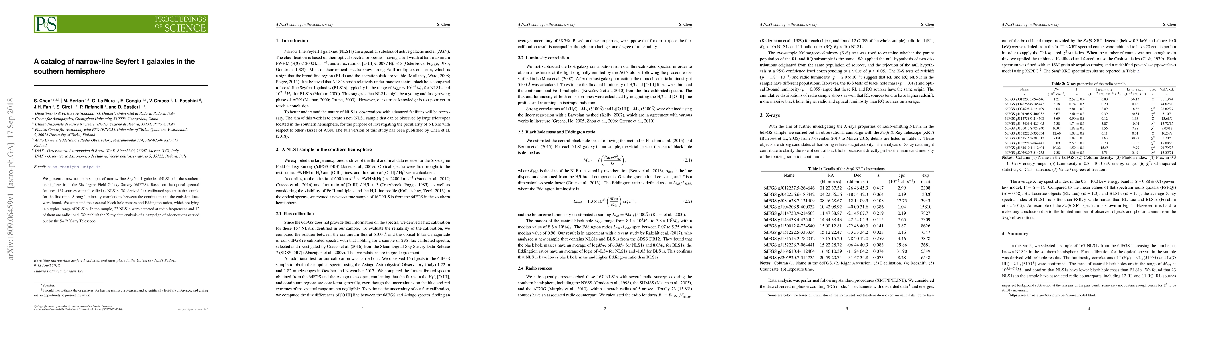 We present a new accurate sample of narrow-line Seyfert 1 galaxies (NLS1s) in the southern hemisphere from the Six-degree Field Galaxy Survey (6dFGS). Based on the optical spectral features, 167 sources were classified as NLS1s. We derived flux-calibrated spectra in the sample for the first time. Strong luminosity correlations between the continuum and the emission lines were found. We estimated their central black hole masses and Eddington ratios, which are lying in a typical range of NLS1s. In the sample, 23 NLS1s were detected at radio frequencies and 12 of them are radio-loud. We publish the X-ray data analysis of a campaign of observations carried out by the Swift X-ray Telescope.