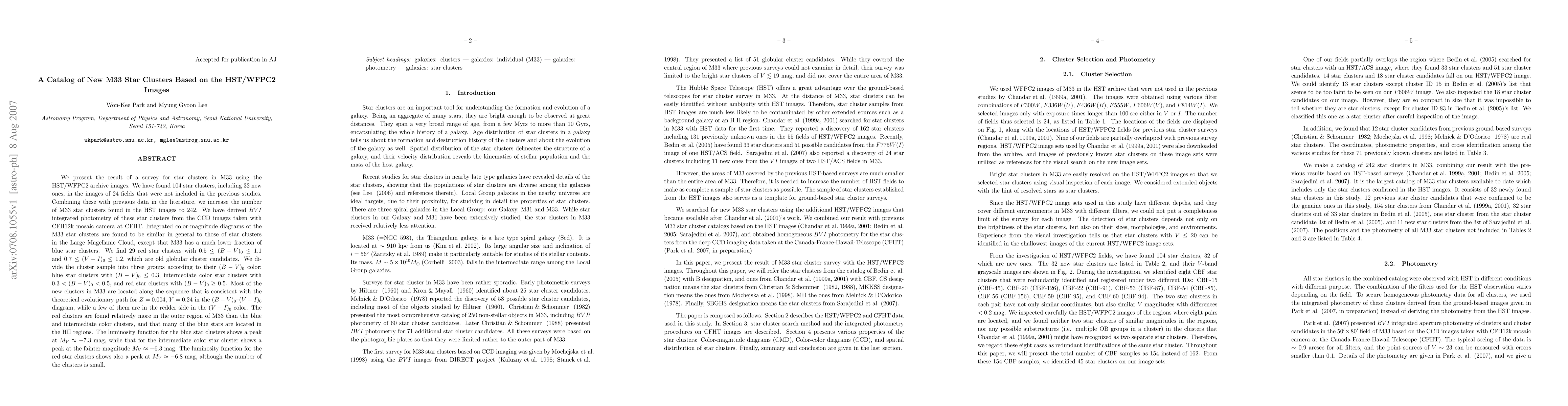 This study identifies 104 star clusters in M33 using HST/WFPC2 images, including 32 new clusters, expanding the total to 242. The clusters are categorized into blue, intermediate, and red groups, with red clusters more prevalent in the outer regions and blue clusters in HII regions.