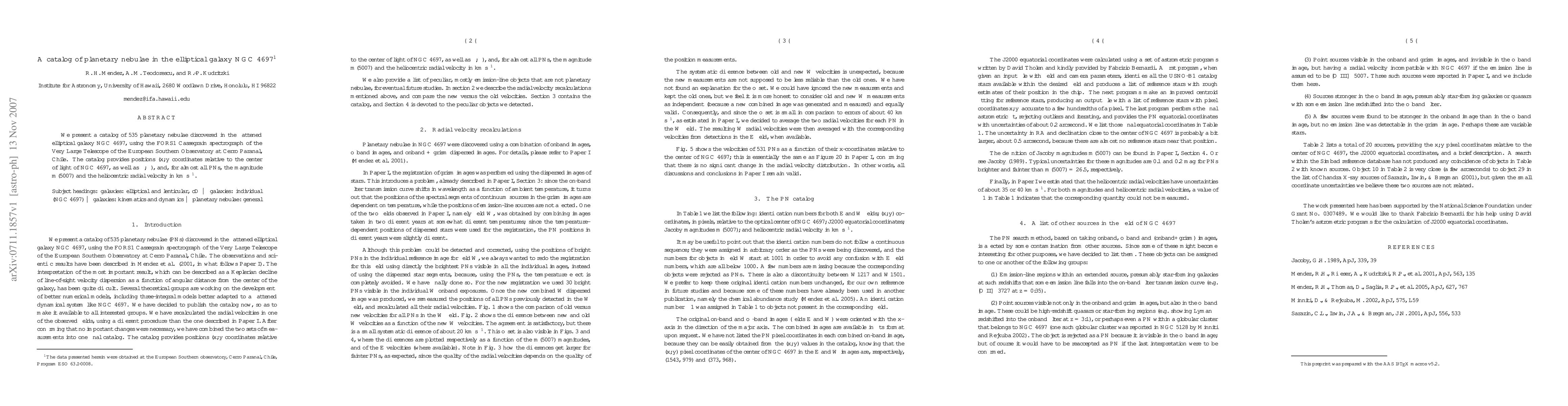 This paper catalogs 535 planetary nebulae in the elliptical galaxy NGC 4697, utilizing data from the FORS1 spectrograph at the European Southern Observatory's Very Large Telescope. The catalog includes detailed positional and radial velocity information for nearly all nebulae.