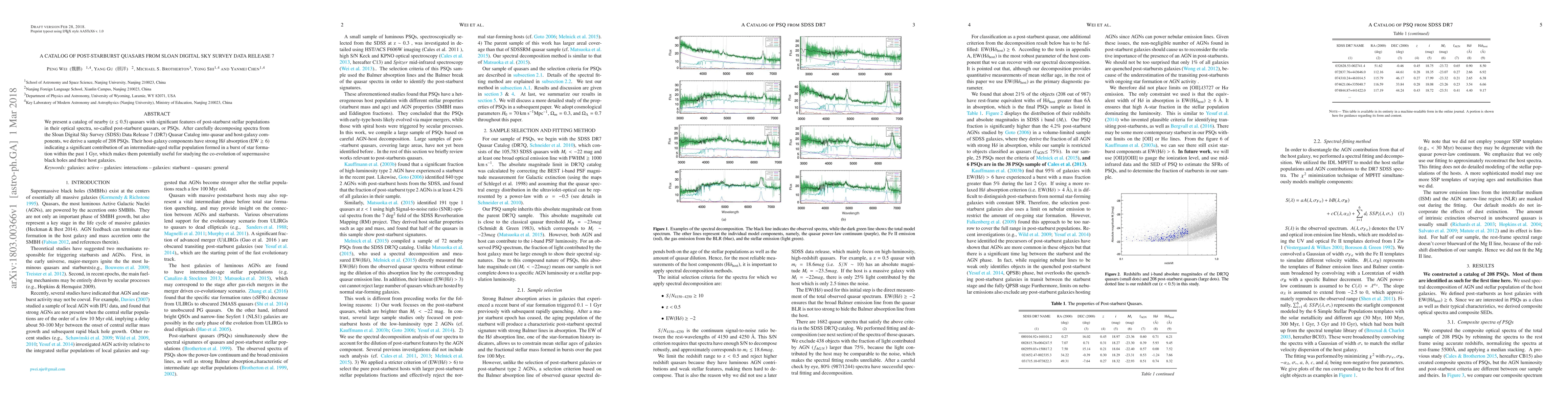This paper catalogs 208 nearby quasars (z ≤ 0.5) from SDSS DR7 with post-starburst features, indicating recent star formation in their host galaxies. These post-starburst quasars (PSQs) provide insights into the co-evolution of supermassive black holes and their host galaxies.