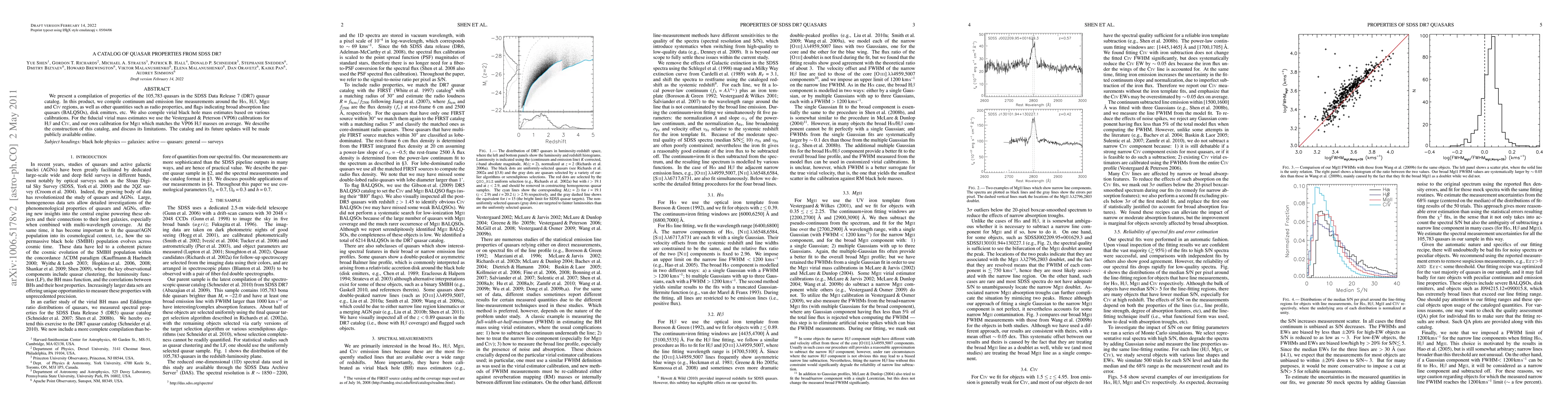 This paper compiles properties of 105,783 quasars from SDSS DR7, including measurements around key emission lines and radio properties, and virial black hole mass estimates using various calibrations. The catalog, with its limitations discussed, will be publicly available for future updates.