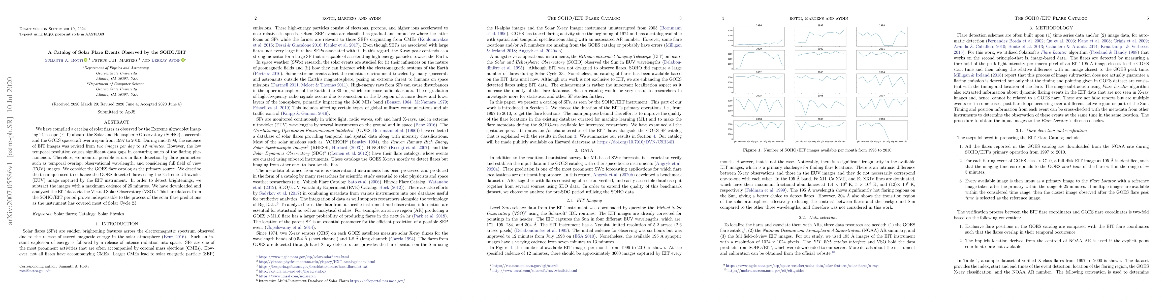 Development of a comprehensive SOHO/EIT flare catalog for predictive and exploratory analytics in flare prediction using machine learning, providing a valuable resource for the solar physics community.
