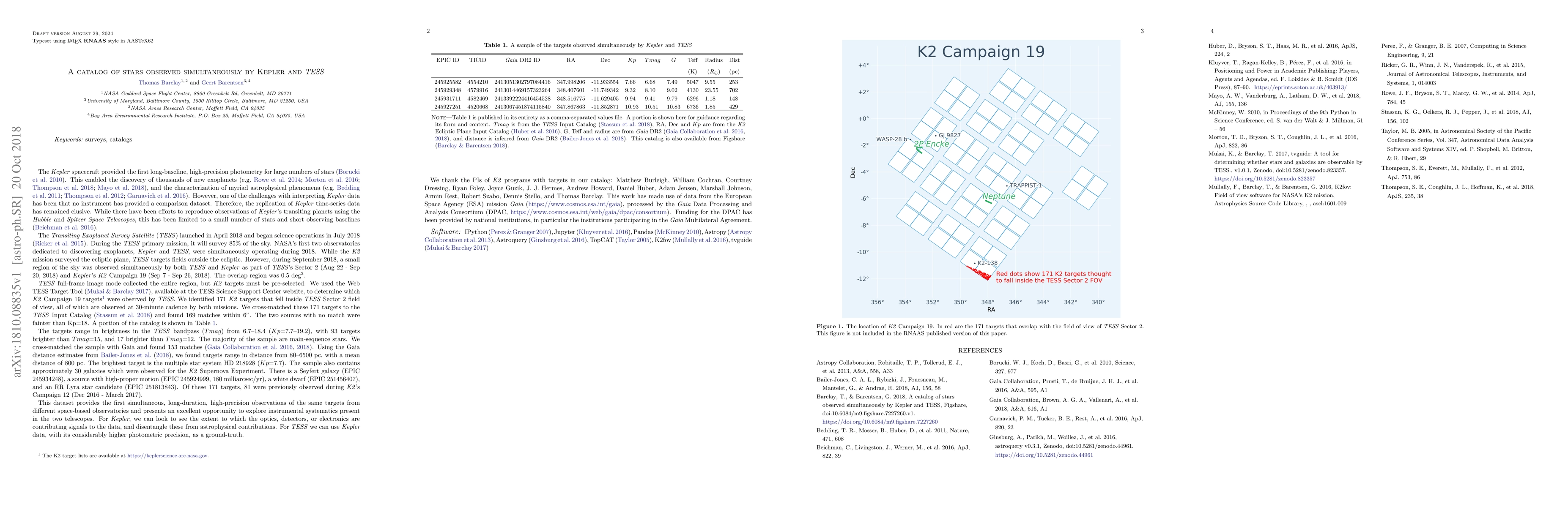 This paper catalogs 171 stars observed simultaneously by Kepler and TESS during September 2018, providing the first long-duration, high-precision comparison dataset from two space-based observatories. This overlap offers valuable insights into instrumental systematics and enhances the interpretation of exoplanetary and astrophysical data.