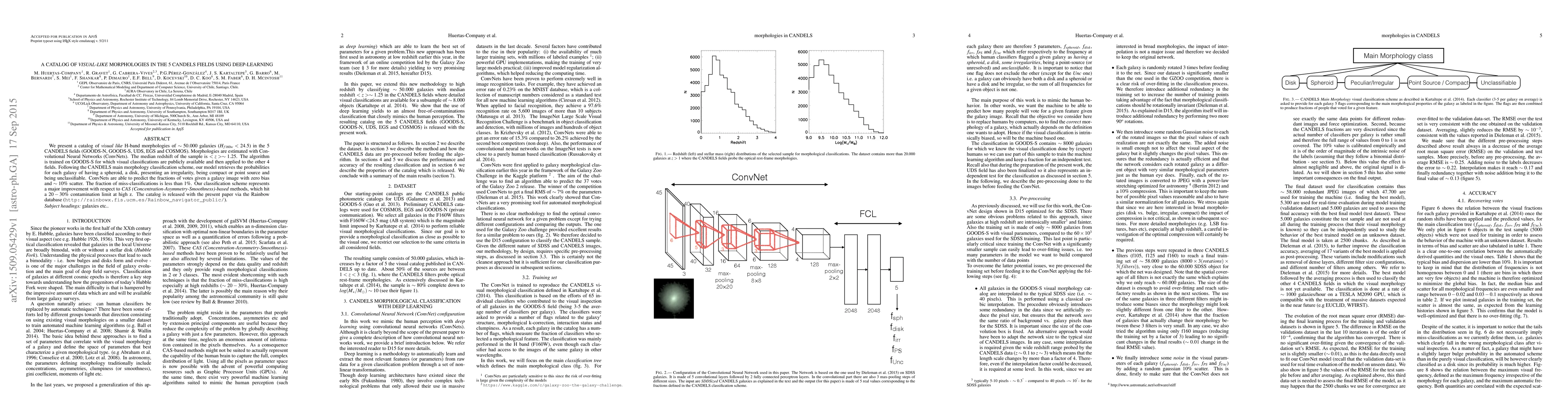 The research employs Convolutional Neural Networks (ConvNets) to estimate visual-like H-band morphologies of ~50,000 galaxies in 5 CANDELS fields (GOODS-S, GOODS-N, UDS, COSMOS, and EGS). The algorithm is trained on GOODS-S using publicly available visual classifications and then applied to the other fields. The model predicts the probabilities of a galaxy having a spheroid, disk, irregularity, being compact, or unclassifiable.