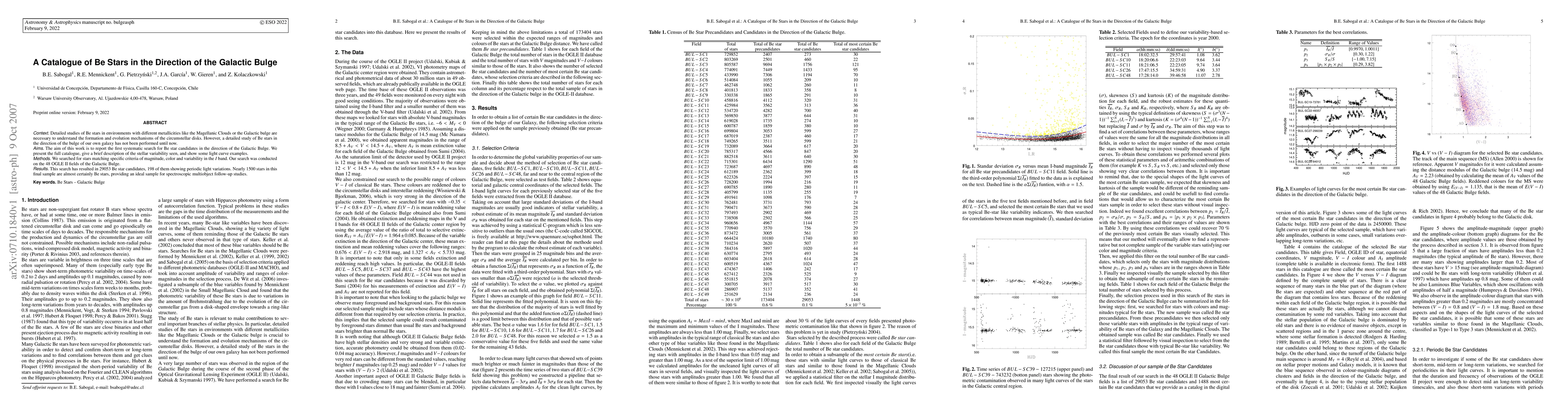 A systematic search for Be star candidates in the direction of the Galactic Bulge identified 29053 stars with periodic light variations, nearly 1500 of which are almost certainly Be stars, providing a valuable sample for follow-up spectroscopic studies.