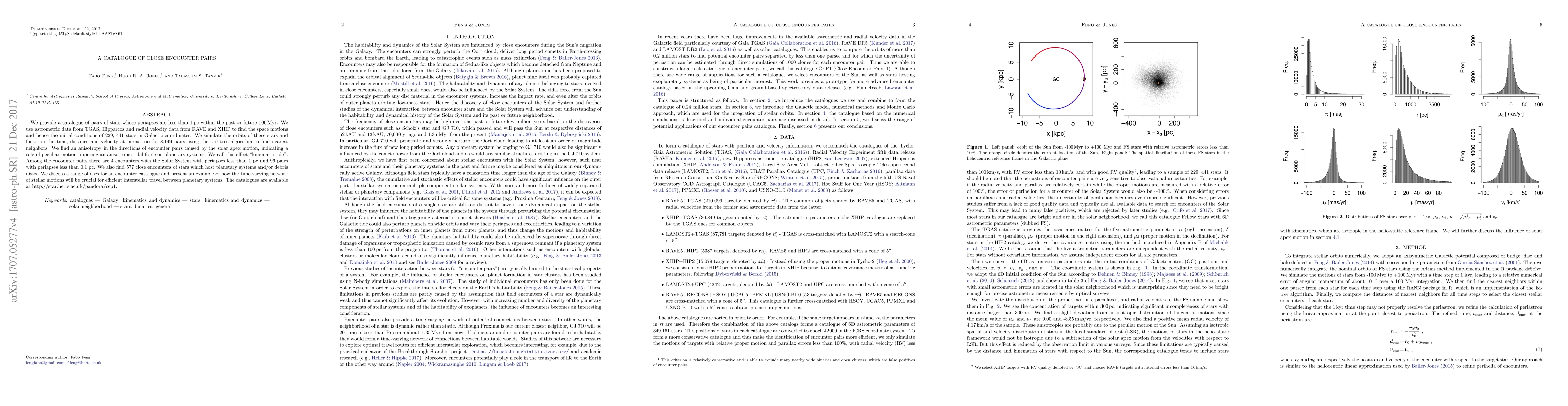 We provide a catalogue of pairs of stars whose periapses are less than 1pc within the past or future 100 Myr. We use astrometric data from TGAS, Hipparcos and radial velocity data from RAVE and XHIP to find the space motions and hence the initial conditions of 229, 441 stars in Galactic coordinates. We simulate the orbits of these stars and focus on the time, distance and velocity at periastron for 8149 pairs using the k-d tree algorithm to find nearest neighbors. We find an anisotropy in the directions of encounter pairs caused by the solar apex motion, indicating a role of peculiar motion imposing an anisotropic tidal force on planetary systems. We call this effect "kinematic tide". Among the encounter pairs there are 4 encounters with the Solar System with periapses less than 1 pc and 96 pairs with periapses less than 0.1 pc. We also find 577 close encounters of stars which host planetary systems and/or debris disks. We discuss a range of uses for an encounter catalogue and present an example of how the time-varying network of stellar motions will be crucial for efficient interstellar travel between planetary systems. The catalogues are available at http://star.herts.ac.uk/pandora/cep1.