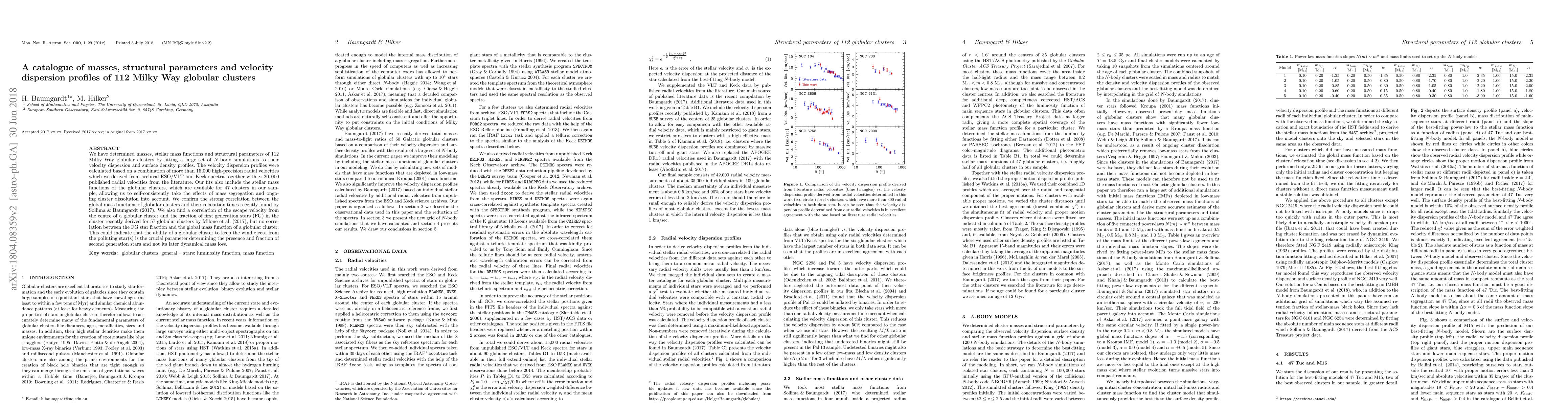 We have determined masses, stellar mass functions and structural parameters of 112 Milky Way globular clusters by fitting a large set of N-body simulations to their velocity dispersion and surface density profiles. The velocity dispersion profiles were calculated based on a combination of more than 15,000 high-precision radial velocities which we derived from archival ESO/VLT and Keck spectra together with ~20,000 published radial velocities from the literature. Our fits also include the stellar mass functions of the globular clusters, which are available for 47 clusters in our sample, allowing us to self-consistently take the effects of mass segregation and ongoing cluster dissolution into account. We confirm the strong correlation between the global mass functions of globular clusters and their relaxation times recently found by Sollima & Baumgardt (2017). We also find a correlation of the escape velocity from the centre of a globular cluster and the fraction of first generation stars (FG) in the cluster recently derived for 57 globular clusters by Milone et al. (2017), but no correlation between the FG star fraction and the global mass function of a globular cluster. This could indicate that the ability of a globular cluster to keep the wind ejecta from the polluting star(s) is the crucial parameter determining the presence and fraction of second generation stars and not its later dynamical mass loss.