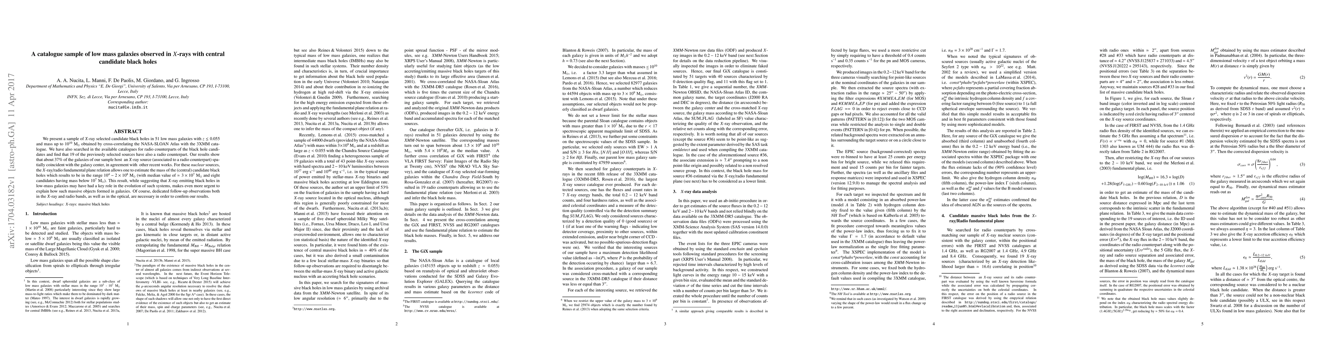 We present a sample of $X$-ray selected candidate black holes in 51 low mass galaxies with $z\le 0.055$ {and mass up to $10^{10}$ M$_{\odot}$} obtained by cross-correlating the NASA-SLOAN Atlas with the 3XMM catalogue. {We have also searched in the available catalogues for radio counterparts of the black hole candidates and find that 19 of the previously selected sources have also a radio counterpart.} Our results show that about $37\%$ of the galaxies of our sample host { an $X$-ray source} (associated to a radio counterpart) spatially coincident with the galaxy center, in agreement with { other recent works}. For these {\it nuclear} sources, the $X$-ray/radio fundamental plane relation allows one to estimate the mass of the (central) candidate black holes which results to be in the range $10^{4}-2\times10^{8}$ M$_{\odot}$ (with median value of $\simeq 3\times 10^7$ M$_{\odot}$ and eight candidates having mass below $10^{7}$ M$_{\odot}$). This result, while suggesting that $X$-ray emitting black holes in low-mass galaxies may have had a key role in the evolution of such systems, makes even more urgent to explain how such massive objects formed in galaxies. {Of course, dedicated follow-up observations both in the $X$-ray and radio bands, as well as in the optical, are necessary in order to confirm our results