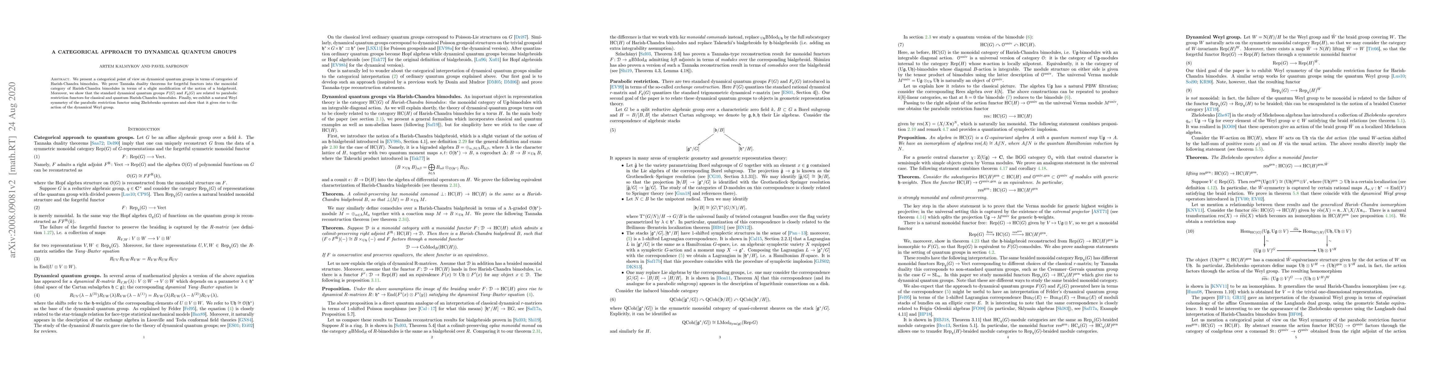 This paper adopts a categorical framework to study dynamical quantum groups through Harish-Chandra bimodules, proving Tannaka duality theorems for forgetful functors and linking standard dynamical quantum groups to parabolic restriction functors. It also demonstrates a Weyl symmetry arising from Zhelobenko operators that corresponds to the dynamical Weyl group.