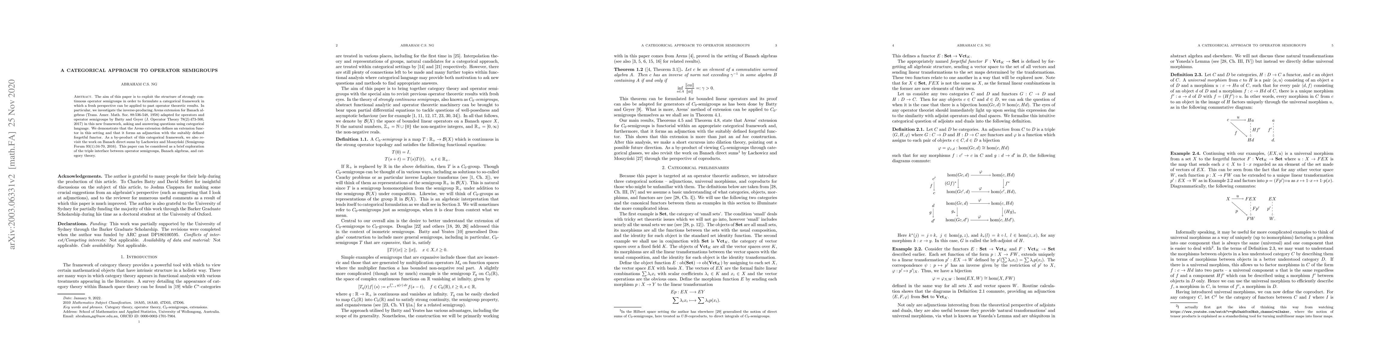 The aim of this paper is to exploit the structure of strongly continuous operator semigroups in order to formulate a categorical framework in which a fresh perspective can be applied to past operator theoretic results. In particular, we investigate the inverse-producing Arens extension for Banach algebras (Trans. Amer. Math. Soc. 88:536-548, 1958) adapted for operators and operator semigroups by Batty and Geyer (J. Operator Theory 78(2):473-500, 2017) in this new framework, asking and answering questions using categorical language. We demonstrate that the Arens extension defines an extension functor in this setting and that it forms an adjunction with the suitably defined forgetful functor. As a by-product of this categorical framework, we also revisit the work on Banach direct sums by Lachowicz and Moszy\'nski (Semigroup Forum 93(1):34-70, 2016). This paper can be considered as a brief exploration of the triple interface between operator semigroups, Banach algebras, and category theory.
