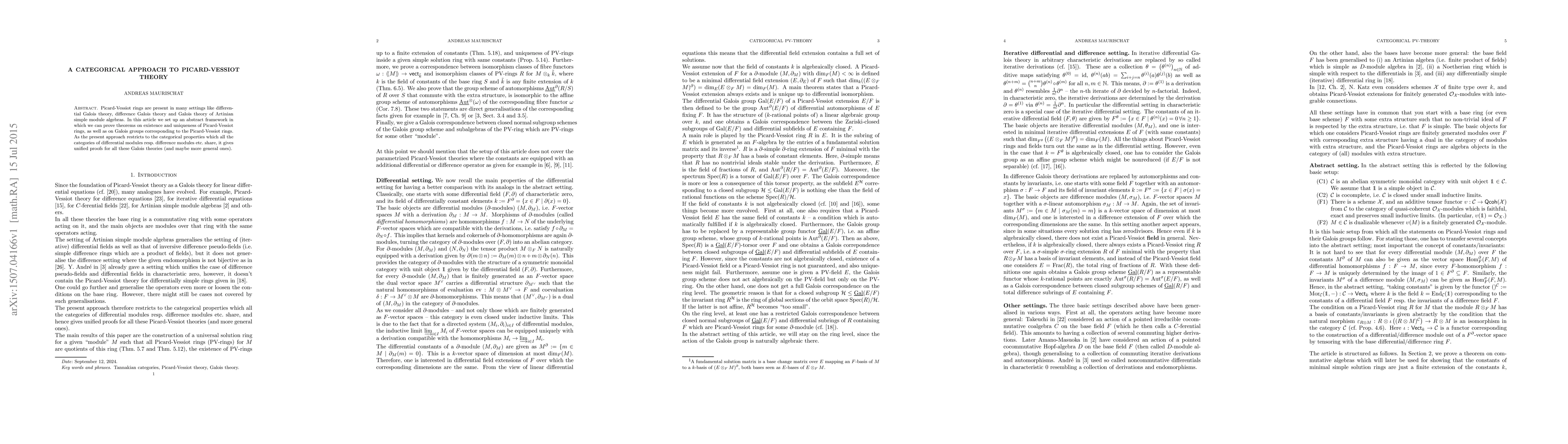 This paper establishes a categorical framework for Picard-Vessiot theory, proving existence and uniqueness of Picard-Vessiot rings within a unified approach applicable to differential, difference, and Artinian simple module Galois theories. The categorical properties provide consistent proofs across these various Galois theories.
