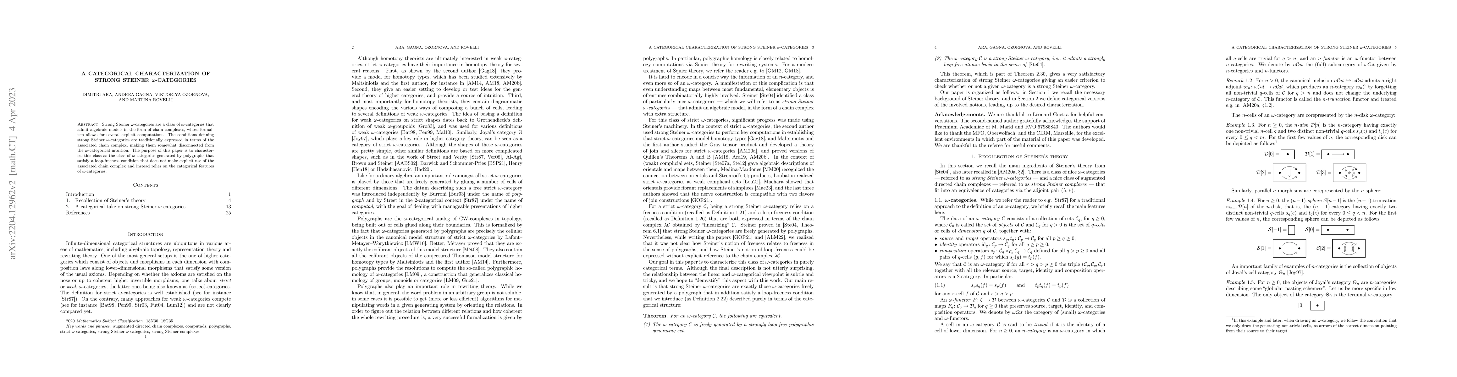 This paper provides a categorical characterization of strong Steiner $\omega$-categories by identifying them as polygraphs that meet a loop-freeness condition, thus connecting their definition more directly to $\omega$-categorical features rather than chain complexes.