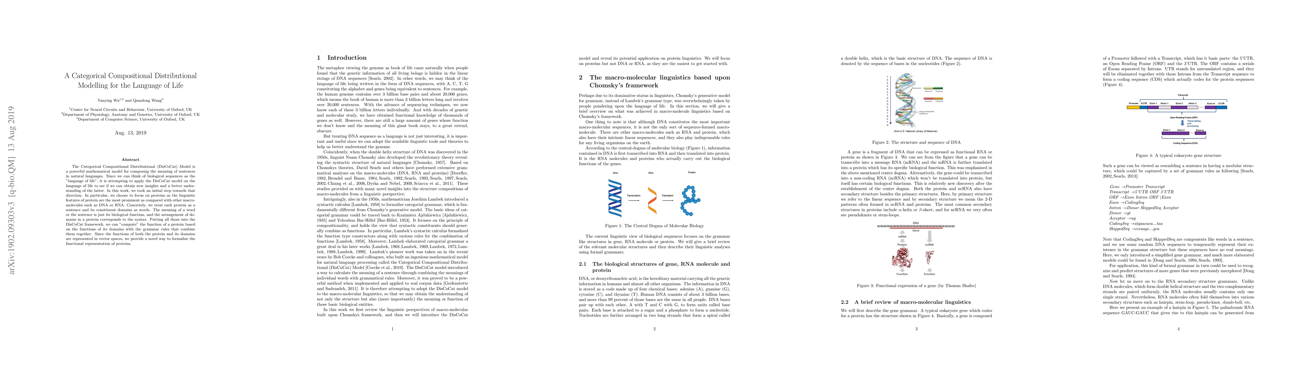 The Categorical Compositional Distributional (DisCoCat) Model is a powerful mathematical model for composing the meaning of sentences in natural languages. Since we can think of biological sequences as the "language of life", it is attempting to apply the DisCoCat model on the language of life to see if we can obtain new insights and a better understanding of the latter. In this work, we took an initial step towards that direction. In particular, we choose to focus on proteins as the linguistic features of protein are the most prominent as compared with other macromolecules such as DNA or RNA. Concretely, we treat each protein as a sentence and its constituent domains as words. The meaning of a word or the sentence is just its biological function, and the arrangement of domains in a protein corresponds to the syntax. Putting all those into the DisCoCat framework, we can "compute" the function of a protein based on the functions of its domains with the grammar rules that combine them together. Since the functions of both the protein and its domains are represented in vector spaces, we provide a novel way to formalize the functional representation of proteins.