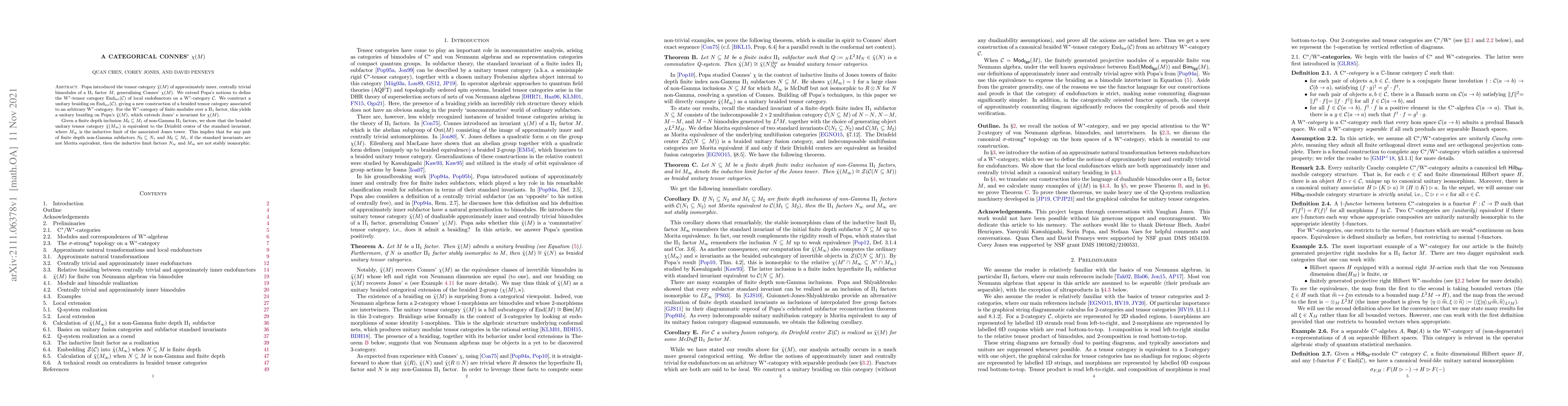 Popa introduced the tensor category $\tilde{\chi}(M)$ of approximately inner, centrally trivial bimodules of a $\rm{II}_{1}$ factor $M$, generalizing Connes' $\chi(M)$. We extend Popa's notions to define the $\rm W^*$-tensor category $\operatorname{End}_{\rm loc}(\mathcal{C})$ of local endofunctors on a $\rm W^*$-category $\mathcal{C}$. We construct a unitary braiding on $\operatorname{End}_{\rm loc}(\mathcal{C})$, giving a new construction of a braided tensor category associated to an arbitrary $\rm W^*$-category. For the $\rm W^*$-category of finite modules over a $\rm{II}_{1}$ factor, this yields a unitary braiding on Popa's $\tilde{\chi}(M)$, which extends Jones' $\kappa$ invariant for $\chi(M)$. Given a finite depth inclusion $M_{0}\subseteq M_{1}$ of non-Gamma $\rm{II}_1$ factors, we show that the braided unitary tensor category $\tilde{\chi}(M_{\infty})$ is equivalent to the Drinfeld center of the standard invariant, where $M_{\infty}$ is the inductive limit of the associated Jones tower. This implies that for any pair of finite depth non-Gamma subfactors $N_{0}\subseteq N_{1}$ and $M_{0}\subseteq M_{1}$, if the standard invariants are not Morita equivalent, then the inductive limit factors $N_{\infty}$ and $M_{\infty}$ are not stably isomorphic.