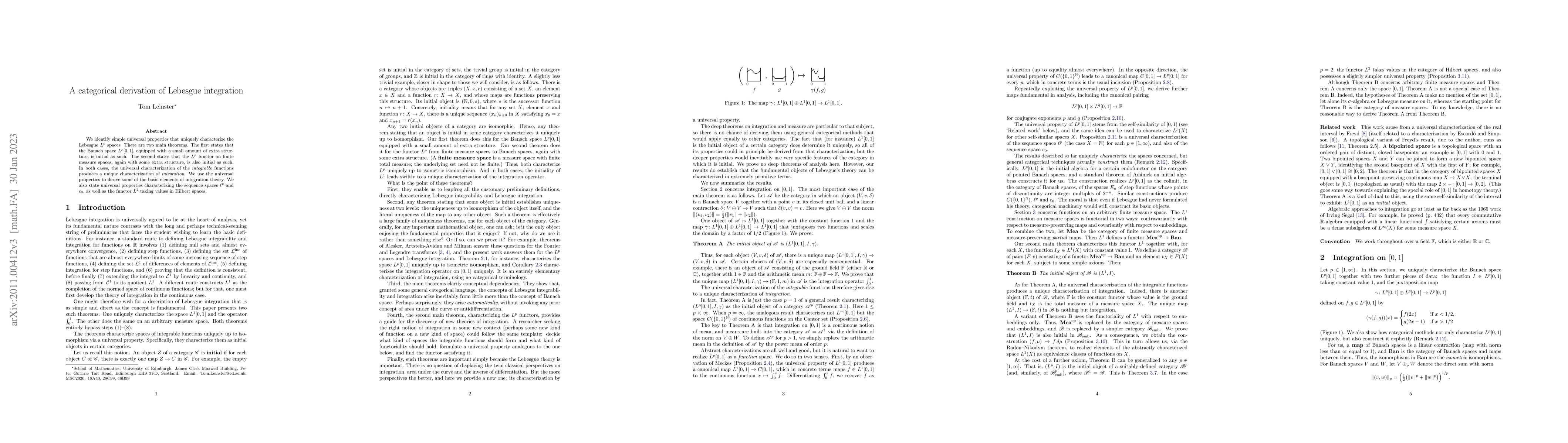 This paper derives Lebesgue integration through categorical universal properties, showing that $L^p$ spaces and $L^p$ functors on finite measure spaces are initial with extra structure. It also characterizes sequence spaces $\ell^p$ and $c_0$ and the $L^2$ functor in Hilbert spaces.