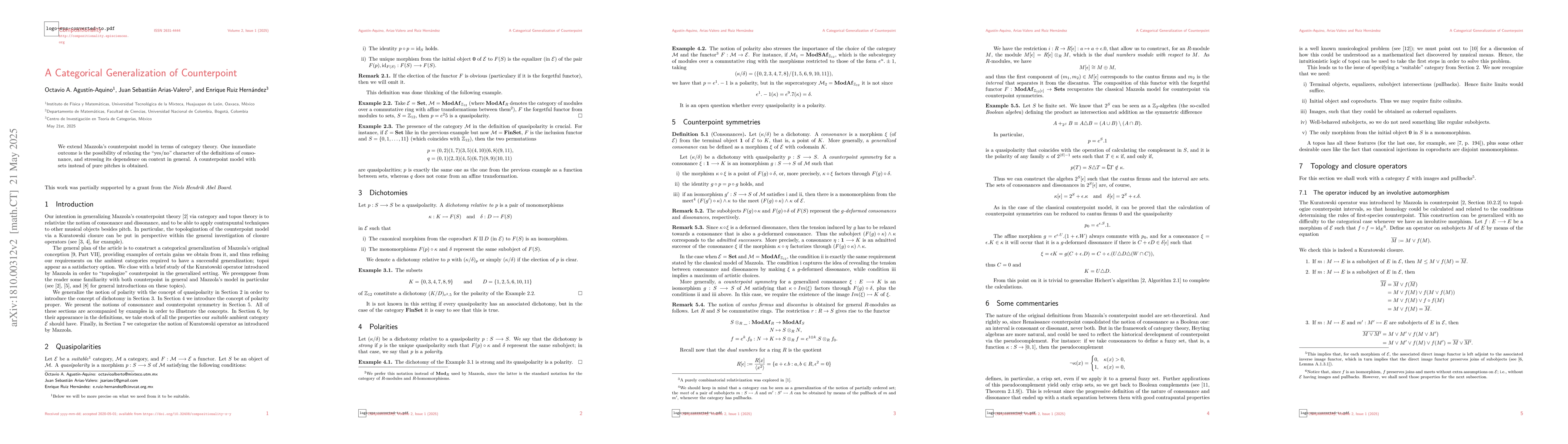 This paper generalizes Mazzola's counterpoint model using category theory, allowing for a contextual understanding of consonance rather than a binary definition, and introduces a model based on sets instead of individual pitches.