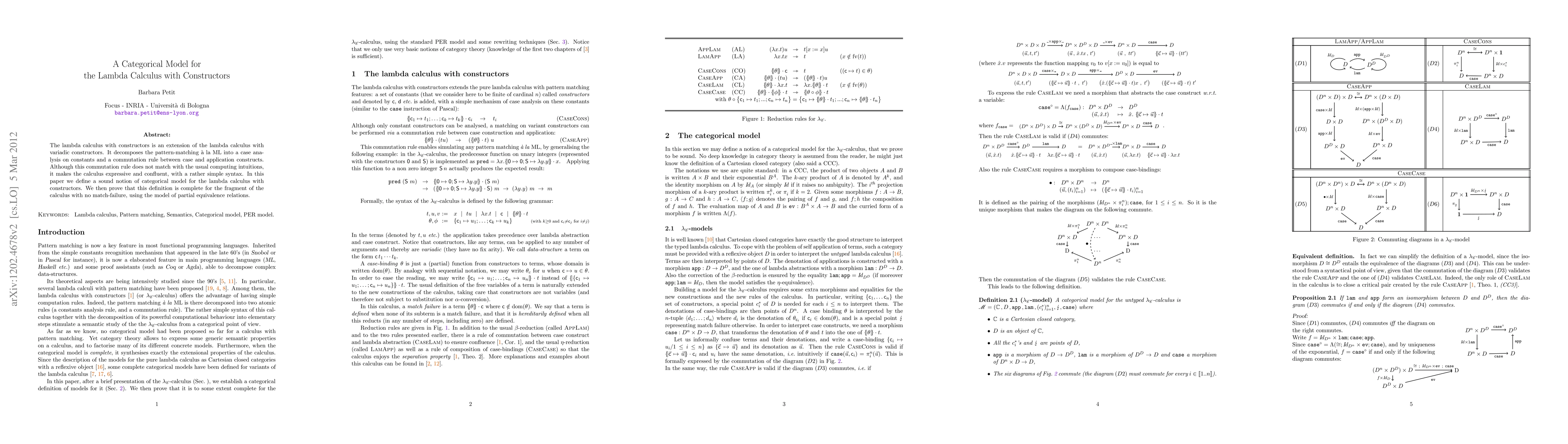 This paper introduces a categorical model for the lambda calculus with constructors, extending traditional lambda calculus with variadic constructors for pattern matching. It proves the model's soundness and completeness for a fragment without match-failure using partial equivalence relations.