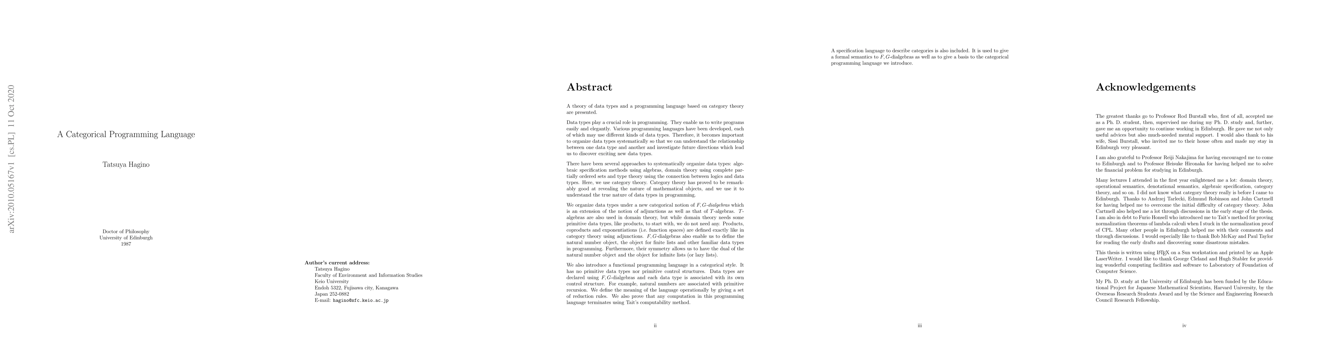 A theory of data types based on category theory is presented. We organize data types under a new categorical notion of F,G-dialgebras which is an extension of the notion of adjunctions as well as that of T-algebras. T-algebras are also used in domain theory, but while domain theory needs some primitive data types, like products, to start with, we do not need any. Products, coproducts and exponentiations (i.e. function spaces) are defined exactly like in category theory using adjunctions. F,G-dialgebras also enable us to define the natural number object, the object for finite lists and other familiar data types in programming. Furthermore, their symmetry allows us to have the dual of the natural number object and the object for infinite lists (or lazy lists). We also introduce a programming language in a categorical style using F,G-dialgebras as its data type declaration mechanism. We define the meaning of the language operationally and prove that any program terminates using Tait's computability method.