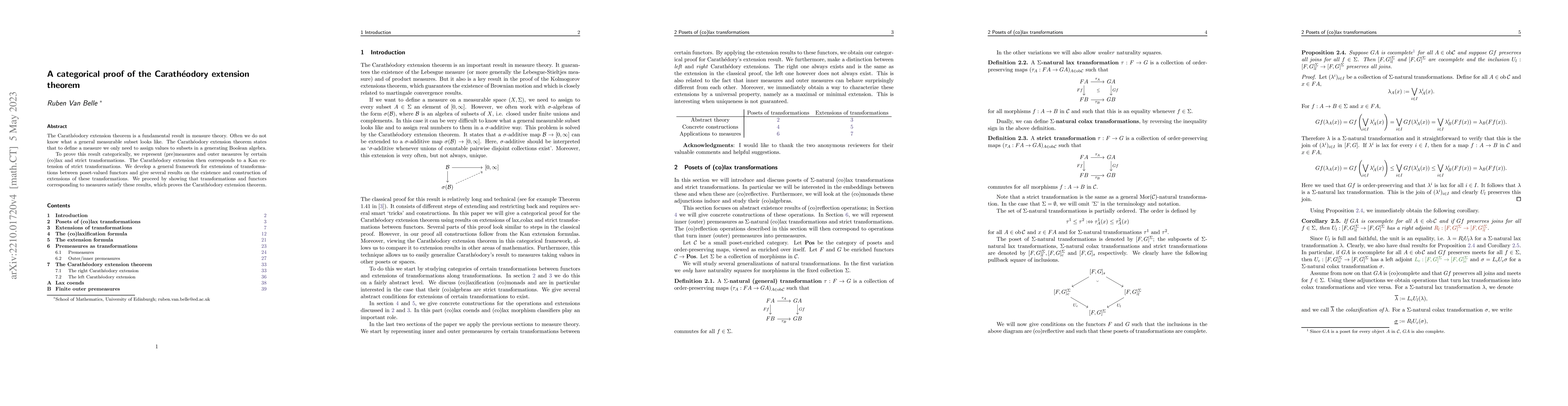 This paper provides a categorical proof of the Carathéodory extension theorem in measure theory, showing that a measure can be extended by defining it on a generating Boolean algebra. It employs (co)lax and strict transformations to represent (pre)measures and outer measures, establishing a framework for their extensions.