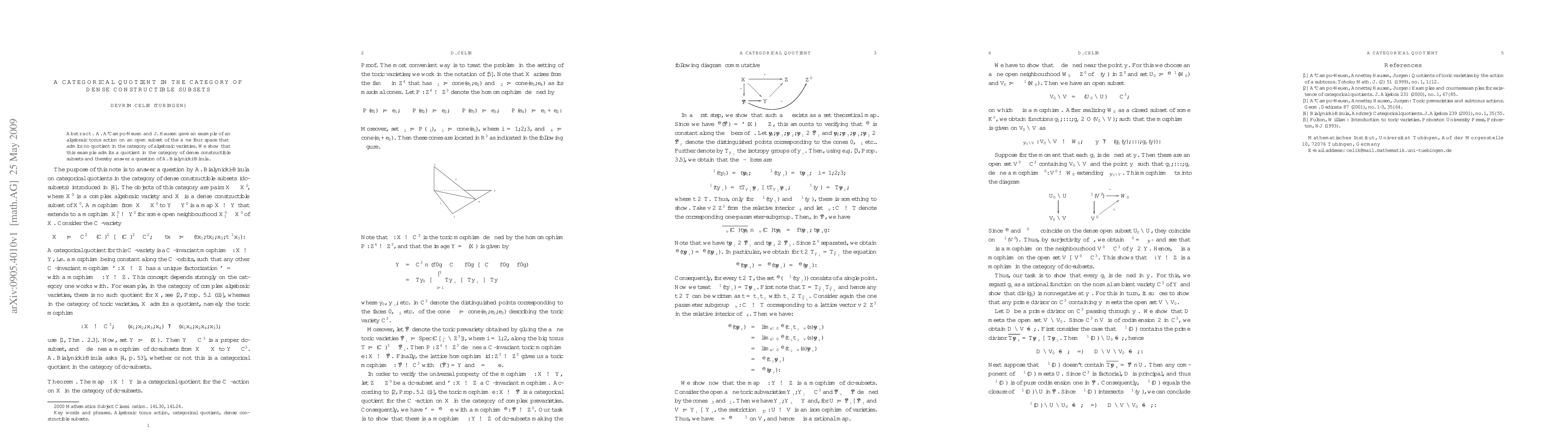 A. A'Campo-Neuen and J. Hausen gave an example of an algebraic torus action on an open subset of the affine four space that admits no quotient in the category of algebraic varieties. We show that this example admits a quotient in the category of dense constructible subsets and thereby answer a question of A. Bialynicki-Birula.