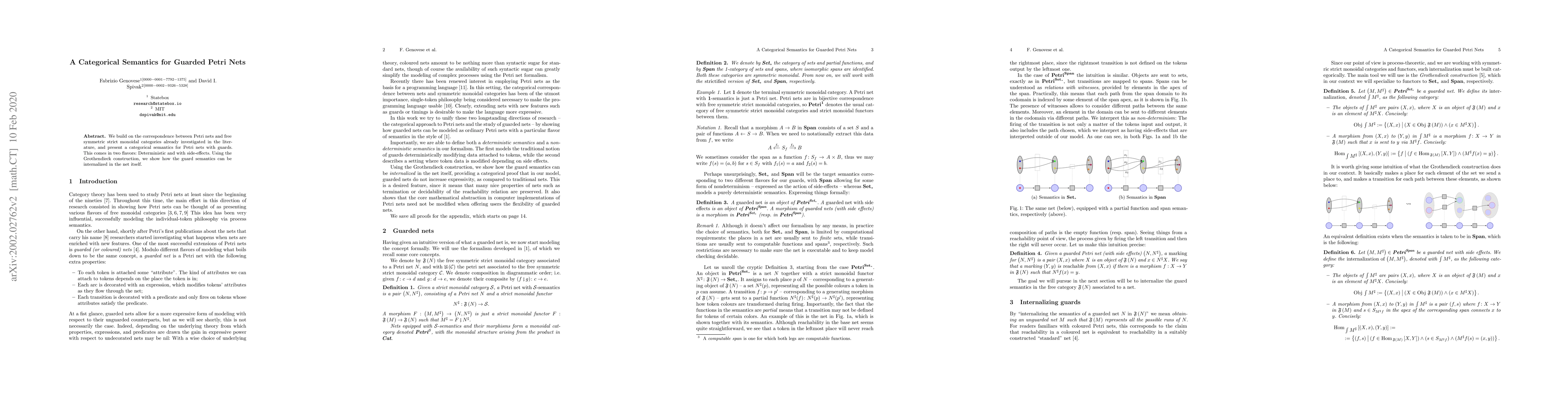 This paper develops a categorical semantics for guarded Petri nets, utilizing the Grothendieck construction to internalize guard semantics within the net, offering both deterministic and side-effect versions. The approach builds on the established correspondence between Petri nets and free symmetric strict monoidal categories.