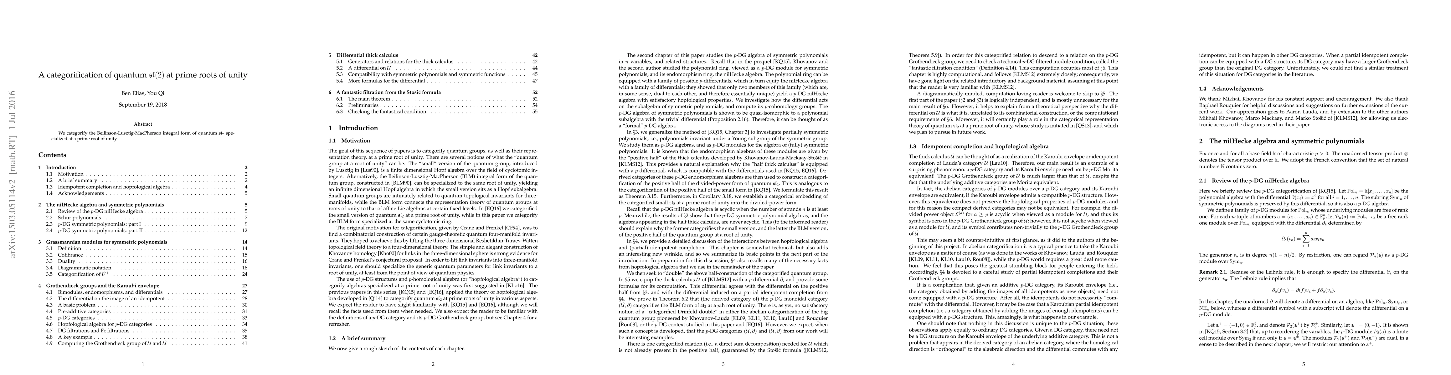 This paper categorifies the Beilinson-Lusztig-MacPherson integral form of quantum sl(2) algebra at a prime root of unity, providing a richer, higher-dimensional perspective on the algebraic structure. The categorification uses techniques from representation theory and homological algebra.