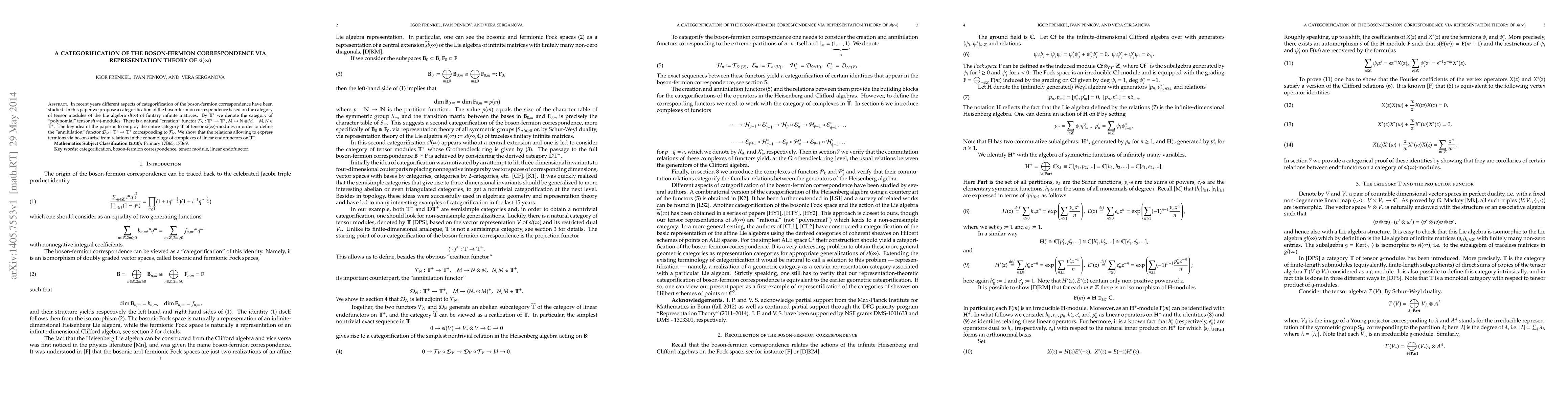 This paper proposes a categorification of the boson-fermion correspondence using the representation theory of the Lie algebra $sl(\infty)$. It employs the category of tensor modules to define an "annihilation" functor, demonstrating that fermionic relations emerge from cohomological relations in the category.