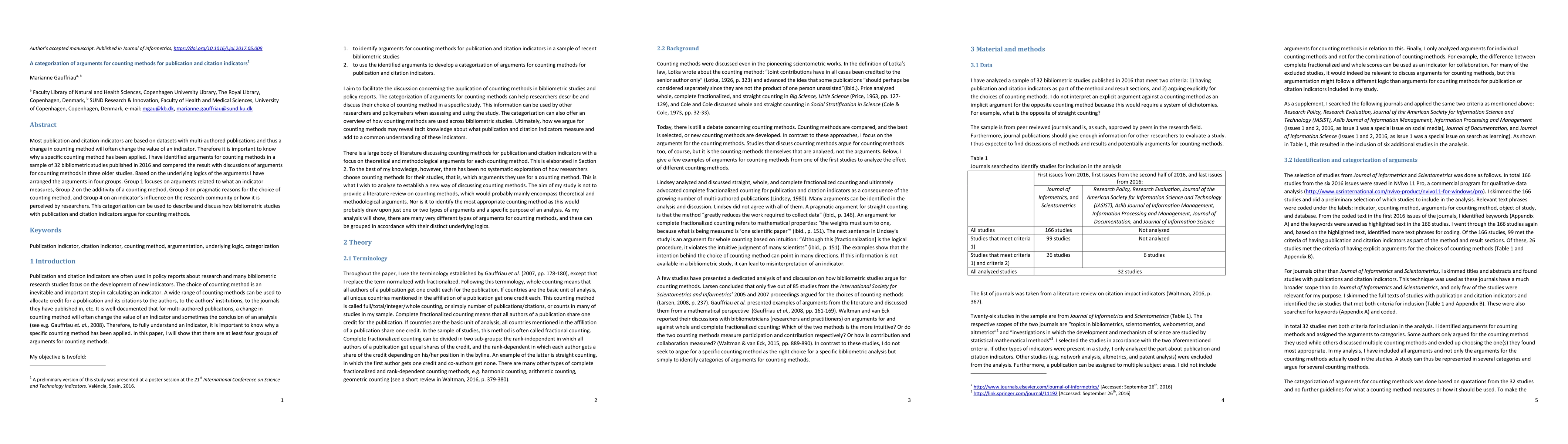 This paper categorizes arguments for counting methods used in publication and citation indicators into four groups: measurement focus, additivity, pragmatic reasons, and community impact. The study analyzes 32 bibliometric papers from 2016 and compares them with older studies to provide a framework for understanding the rationale behind counting method choices in bibliometric research.