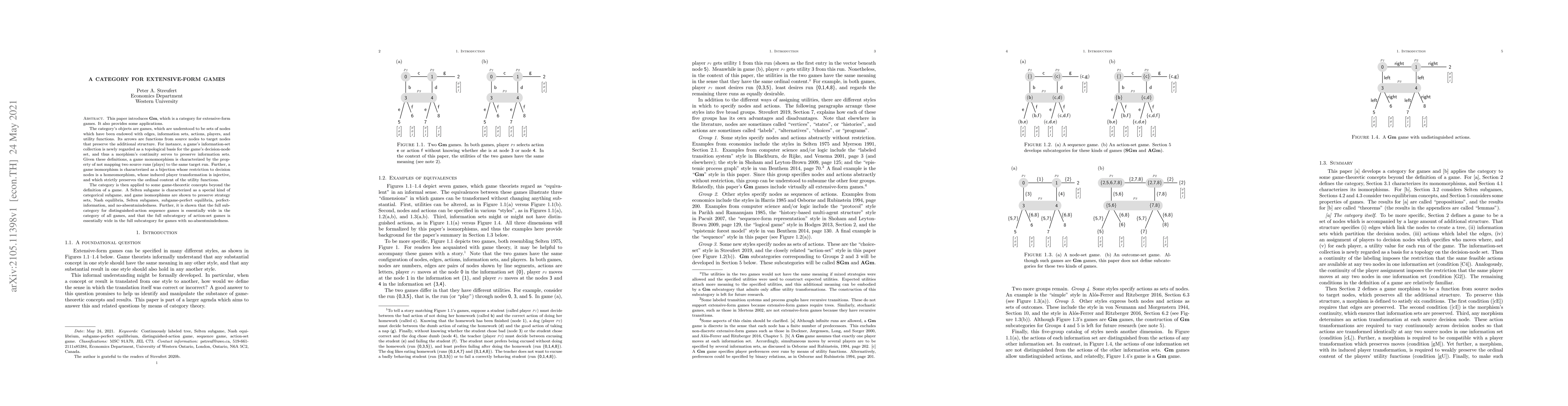 This paper introduces Gm, which is a category for extensive-form games. It also provides some applications. The category's objects are games, which are understood to be sets of nodes which have been endowed with edges, information sets, actions, players, and utility functions. Its arrows are functions from source nodes to target nodes that preserve the additional structure. For instance, a game's information-set collection is newly regarded as a topological basis for the game's decision-node set, and thus a morphism's continuity serves to preserve information sets. Given these definitions, a game monomorphism is characterized by the property of not mapping two source runs (plays) to the same target run. Further, a game isomorphism is characterized as a bijection whose restriction to decision nodes is a homeomorphism, whose induced player transformation is injective, and which strictly preserves the ordinal content of the utility functions. The category is then applied to some game-theoretic concepts beyond the definition of a game. A Selten subgame is characterized as a special kind of categorical subgame, and game isomorphisms are shown to preserve strategy sets, Nash equilibria, Selten subgames, subgame-perfect equilibria, perfect-information, and no-absentmindedness. Further, it is shown that the full subcategory for distinguished-action sequence games is essentially wide in the category of all games, and that the full subcategory of action-set games is essentially wide in the full subcategory for games with no-absentmindedness.