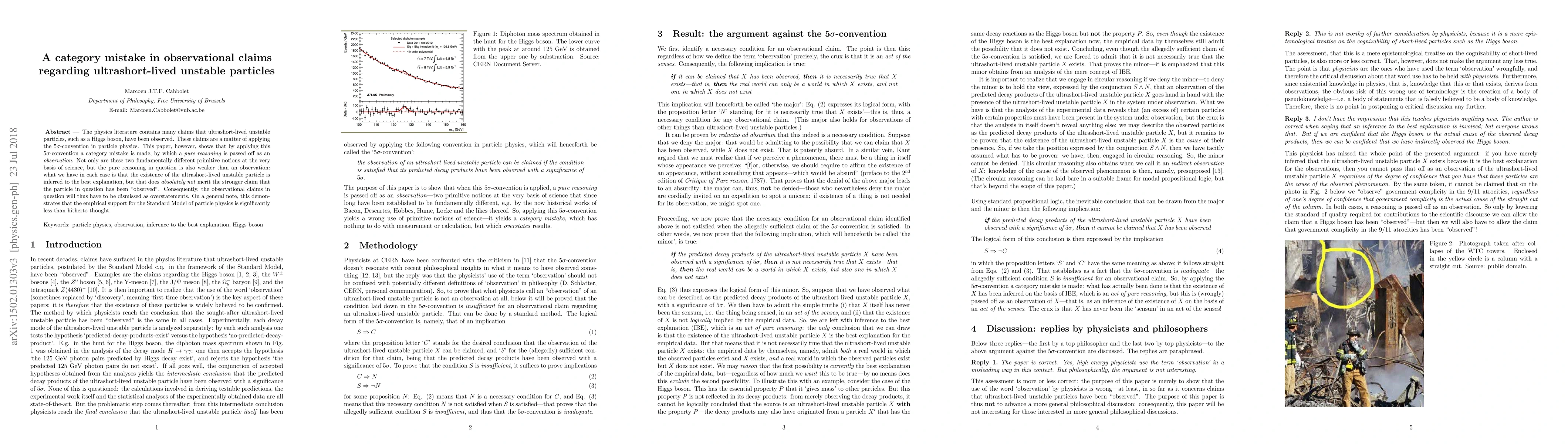 The physics literature contains many claims that ultrashort-lived unstable particles, such as a Higgs boson, have been observed. These claims are a matter of applying the $5\sigma$-convention in particle physics. This paper, however, shows that by applying this $5\sigma$-convention a category mistake is made, by which a pure reasoning is passed off as an observation. Not only are these two fundamentally different primitive notions at the very basis of science, but the pure reasoning in question is also weaker than an observation: what we have in each case is that the existence of the ultrashort-lived unstable particle is inferred to the best explanation, but that does absolutely not merit the stronger claim that the particle in question has been "observed". Consequently, the observational claims in question will thus have to be dismissed as overstatements. On a general note, this demonstrates that the empirical support for the Standard Model of particle physics is significantly less than hitherto thought.