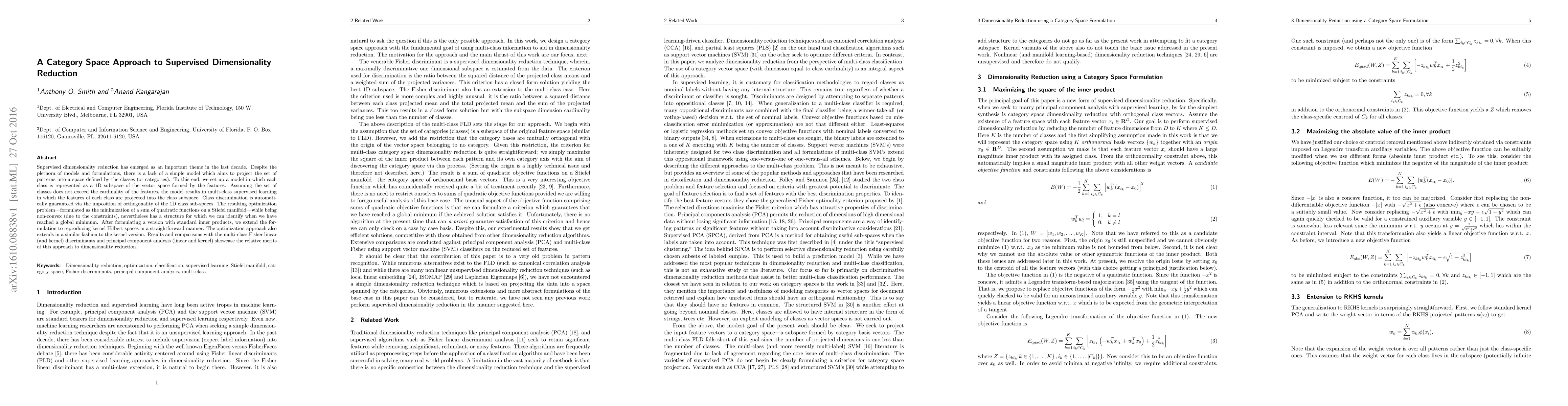 Supervised dimensionality reduction has emerged as an important theme in the last decade. Despite the plethora of models and formulations, there is a lack of a simple model which aims to project the set of patterns into a space defined by the classes (or categories). To this end, we set up a model in which each class is represented as a 1D subspace of the vector space formed by the features. Assuming the set of classes does not exceed the cardinality of the features, the model results in multi-class supervised learning in which the features of each class are projected into the class subspace. Class discrimination is automatically guaranteed via the imposition of orthogonality of the 1D class sub-spaces. The resulting optimization problem - formulated as the minimization of a sum of quadratic functions on a Stiefel manifold - while being non-convex (due to the constraints), nevertheless has a structure for which we can identify when we have reached a global minimum. After formulating a version with standard inner products, we extend the formulation to reproducing kernel Hilbert spaces in a straightforward manner. The optimization approach also extends in a similar fashion to the kernel version. Results and comparisons with the multi-class Fisher linear (and kernel) discriminants and principal component analysis (linear and kernel) showcase the relative merits of this approach to dimensionality reduction.