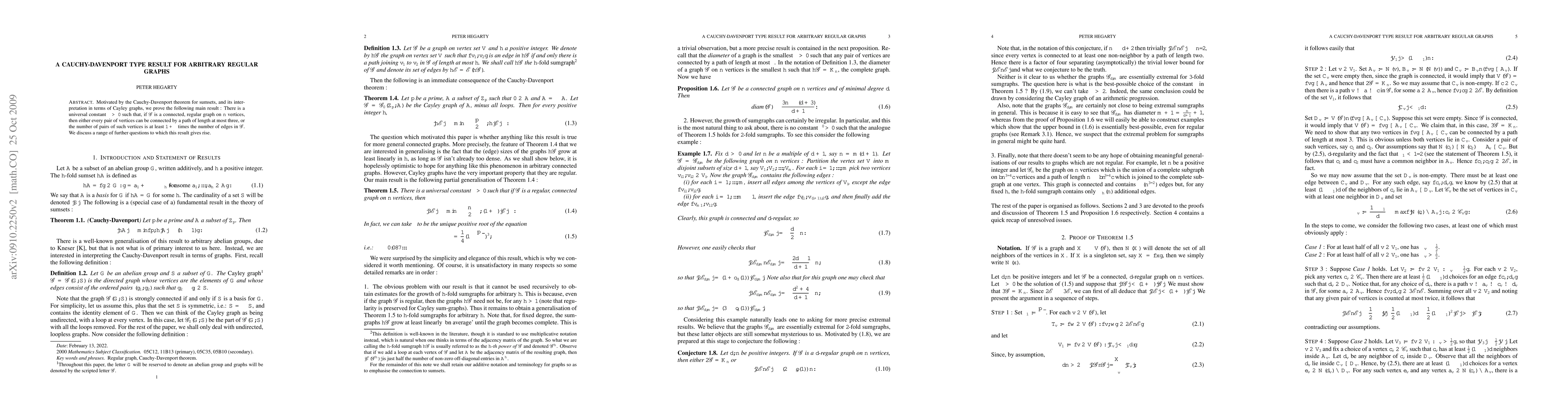 Motivated by the Cauchy-Davenport theorem for sumsets, and its interpretation in terms of Cayley graphs, we prove the following main result : There is a universal constant e > 0 such that, if G is a connected, regular graph on n vertices, then either every pair of vertices can be connected by a path of length at most 3, or the number of pairs of such vertices is at least 1+e times the number of edges in G. We discuss a range of further questions to which this result gives rise.