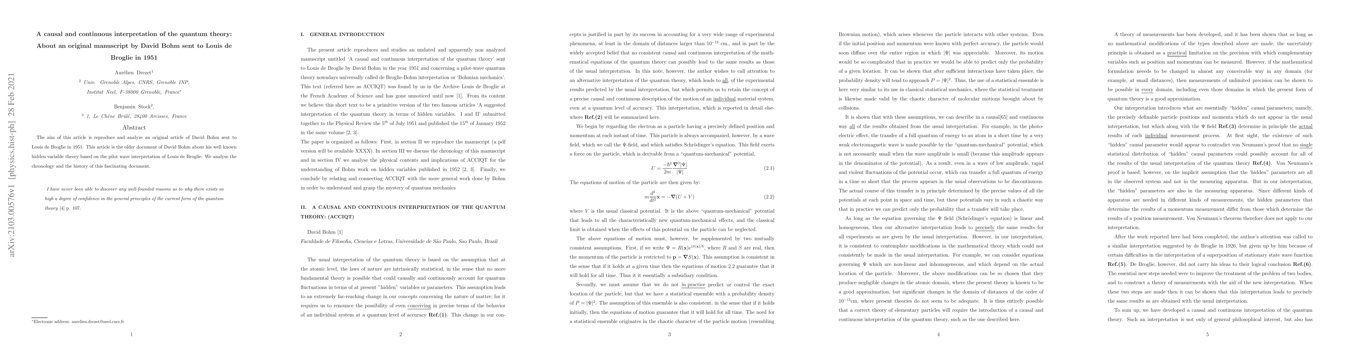 Summary: This paper reproduces and analyzes David Bohm's 1951 manuscript to Louis de Broglie, presenting his early hidden variable theory based on the pilot wave interpretation. It explores the historical context and significance of this foundational document in quantum mechanics.