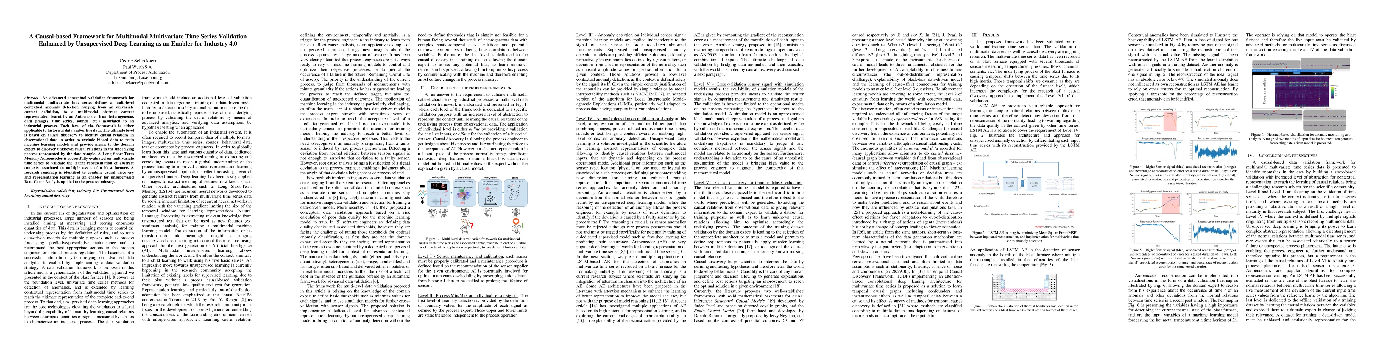 An advanced conceptual validation framework for multimodal multivariate time series defines a multi-level contextual anomaly detection ranging from an univariate context definition, to a multimodal abstract context representation learnt by an Autoencoder from heterogeneous data (images, time series, sounds, etc.) associated to an industrial process. Each level of the framework is either applicable to historical data and/or live data. The ultimate level is based on causal discovery to identify causal relations in observational data in order to exclude biased data to train machine learning models and provide means to the domain expert to discover unknown causal relations in the underlying process represented by the data sample. A Long Short-Term Memory Autoencoder is successfully evaluated on multivariate time series to validate the learnt representation of abstract contexts associated to multiple assets of a blast furnace. A research roadmap is identified to combine causal discovery and representation learning as an enabler for unsupervised Root Cause Analysis applied to the process industry.