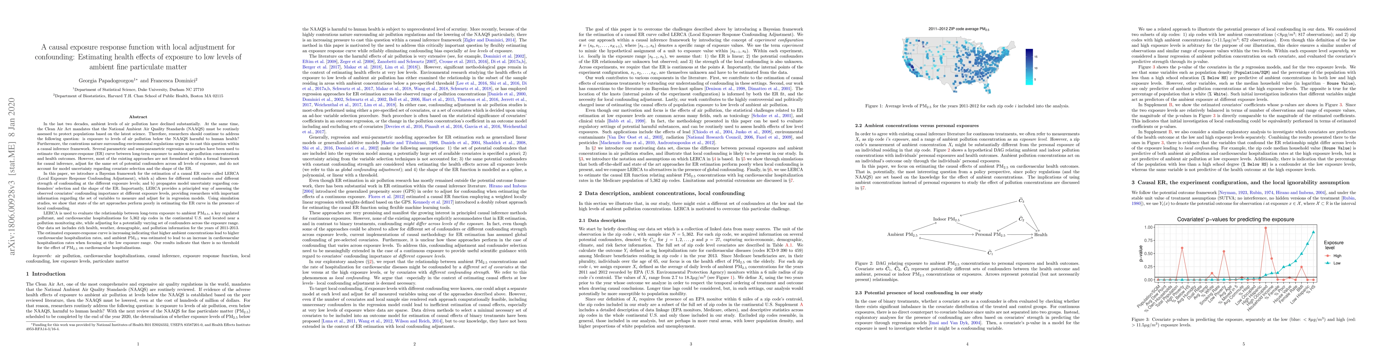 The Clean Air Act mandates that the National Ambient Air Quality Standards (NAAQS) must be routinely assessed to protect populations based on the latest science. Therefore, researchers should continue to address whether exposure to levels of air pollution below the NAAQS is harmful to human health. The contentious nature surrounding environmental regulations urges us to cast this question within a causal inference framework. Parametric and semi-parametric regression approaches have been used to estimate the exposure-response (ER) curve between ambient air pollution and health outcomes. Most of these approaches are not formulated within a causal framework, adjust for the same covariates across all levels of exposure, and do not account for model uncertainty. We introduce a Bayesian framework for the estimation of a causal ER curve called LERCA (Local Exposure Response Confounding Adjustment), which allows for different confounders and different strength of confounding at the different exposure levels; and propagates uncertainty regarding confounders' selection and the shape of the ER. LERCA provides a principled way of assessing the covariates' confounding importance at different exposure levels, providing researchers with information regarding the variables to adjust for in regression models. Using simulations, we show that state of the art approaches perform poorly in estimating the ER curve in the presence of local confounding. LERCA is used to evaluate the relationship between exposure to ambient PM2.5 and cardiovascular hospitalizations for 5,362 zip codes in the US, while adjusting for a potentially varying set of confounders across the exposure range. Ambient PM2.5 leads to an increase in cardiovascular hospitalization rates when focusing at the low exposure range. Our results indicate that there is no threshold for the effect of PM2.5 on cardiovascular hospitalizations.