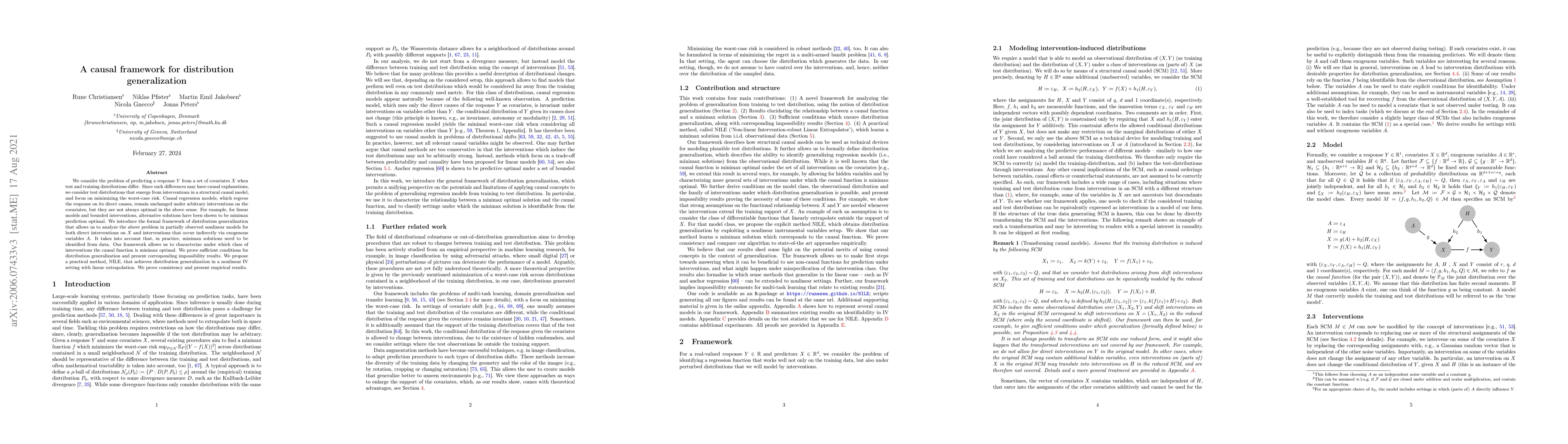 This paper introduces a framework for distribution generalization in causal regression models, aiming to minimize worst-case risk under test distributions differing from training ones.