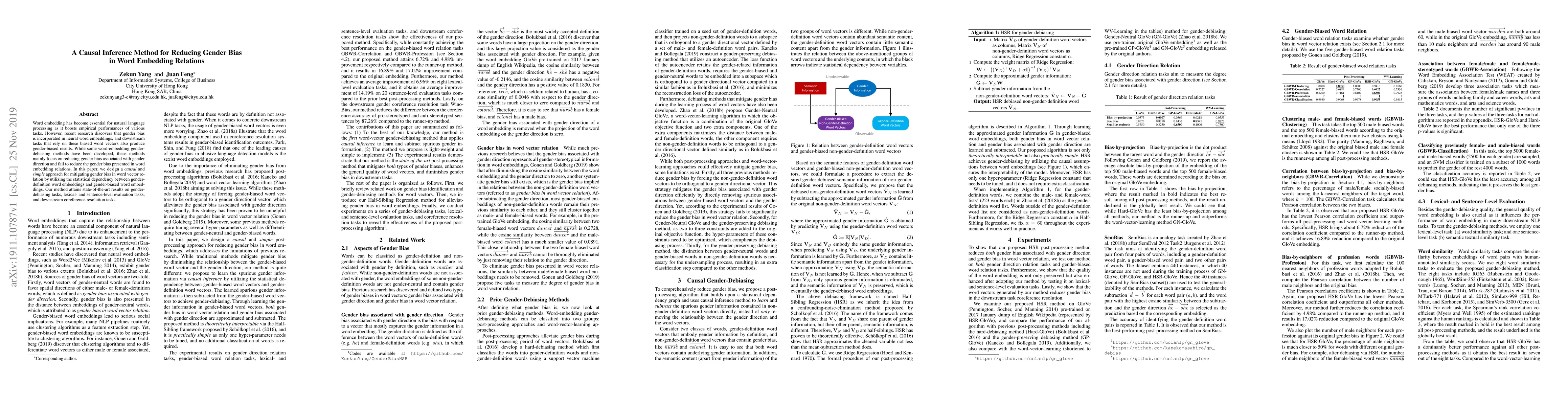 This paper introduces a novel causal inference method to reduce gender bias in word embedding relations, addressing existing limitations in gender-debiasing approaches. The proposed technique leverages statistical dependencies between gender-definition and biased word embeddings, achieving state-of-the-art results in various debiasing and downstream NLP tasks.