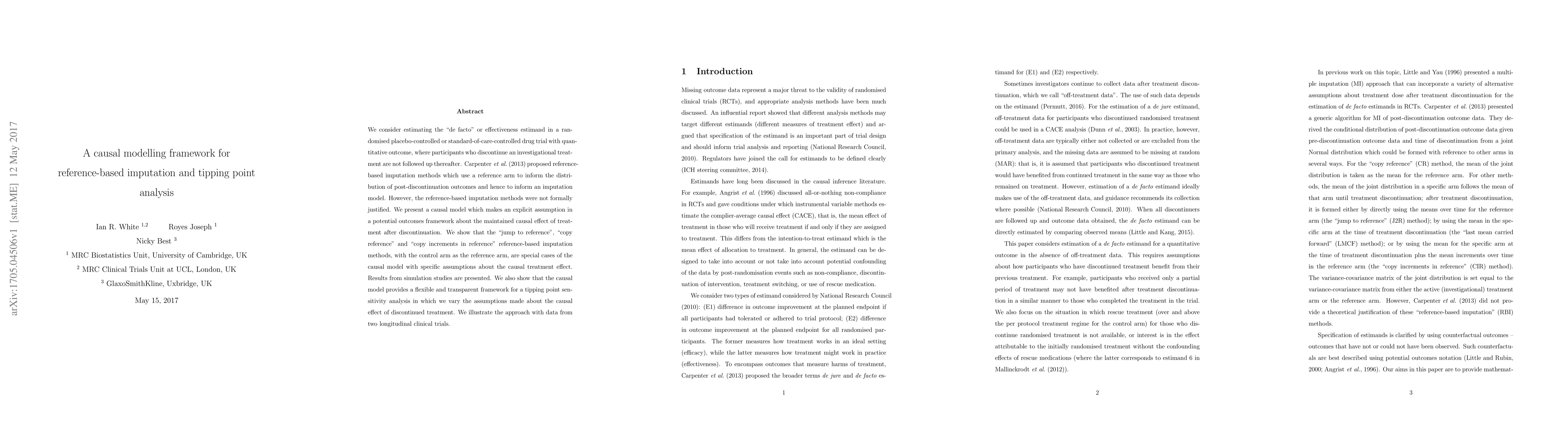 We consider estimating the "de facto" or effectiveness estimand in a randomised placebo-controlled or standard-of-care-controlled drug trial with quantitative outcome, where participants who discontinue an investigational treatment are not followed up thereafter. Carpenter et al (2013) proposed reference-based imputation methods which use a reference arm to inform the distribution of post-discontinuation outcomes and hence to inform an imputation model. However, the reference-based imputation methods were not formally justified. We present a causal model which makes an explicit assumption in a potential outcomes framework about the maintained causal effect of treatment after discontinuation. We show that the "jump to reference", "copy reference" and "copy increments in reference" reference-based imputation methods, with the control arm as the reference arm, are special cases of the causal model with specific assumptions about the causal treatment effect. Results from simulation studies are presented. We also show that the causal model provides a flexible and transparent framework for a tipping point sensitivity analysis in which we vary the assumptions made about the causal effect of discontinued treatment. We illustrate the approach with data from two longitudinal clinical trials.