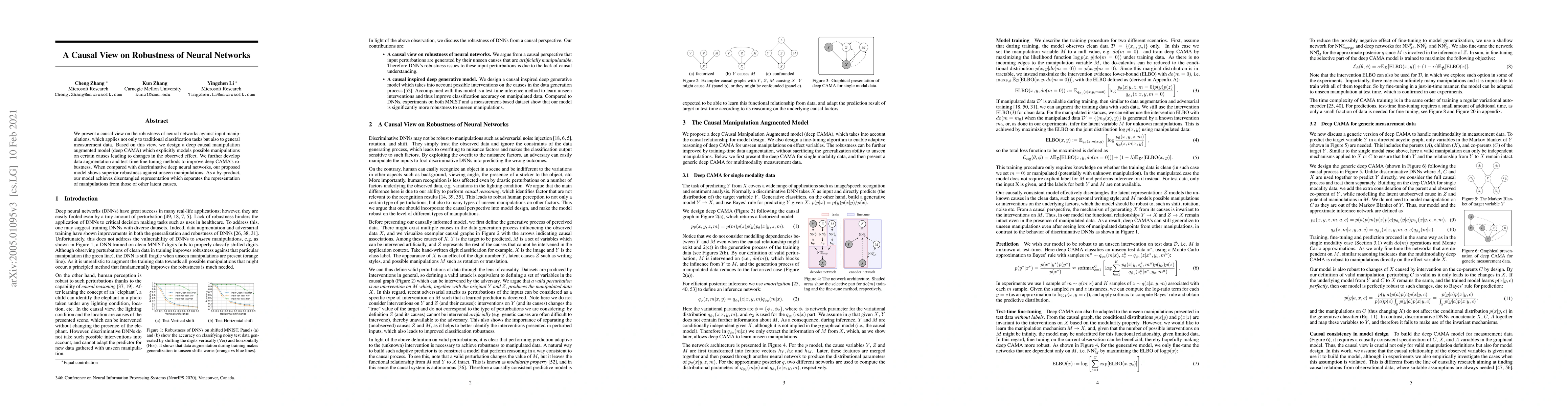 This paper proposes a causal framework to enhance neural network robustness against input manipulations, introducing a deep causal manipulation augmented model (deep CAMA) that models manipulations on causes. The model demonstrates superior robustness compared to traditional networks and achieves disentangled representations.