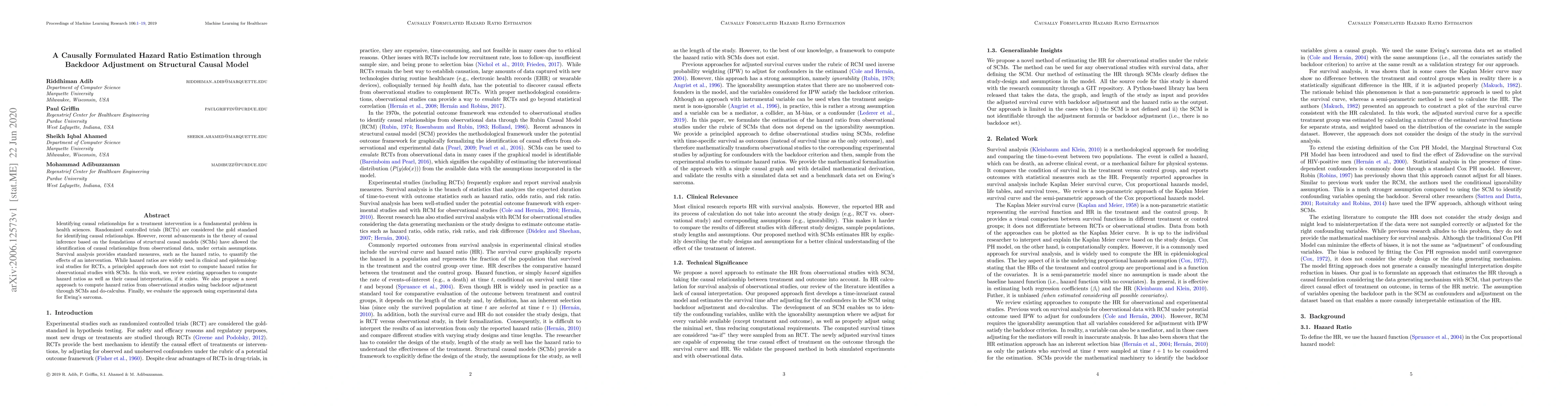 This paper proposes a novel method for estimating hazard ratios from observational data using structural causal models and backdoor adjustment, addressing the lack of a principled approach for such estimations. The method is evaluated using experimental data from Ewing's sarcoma studies.