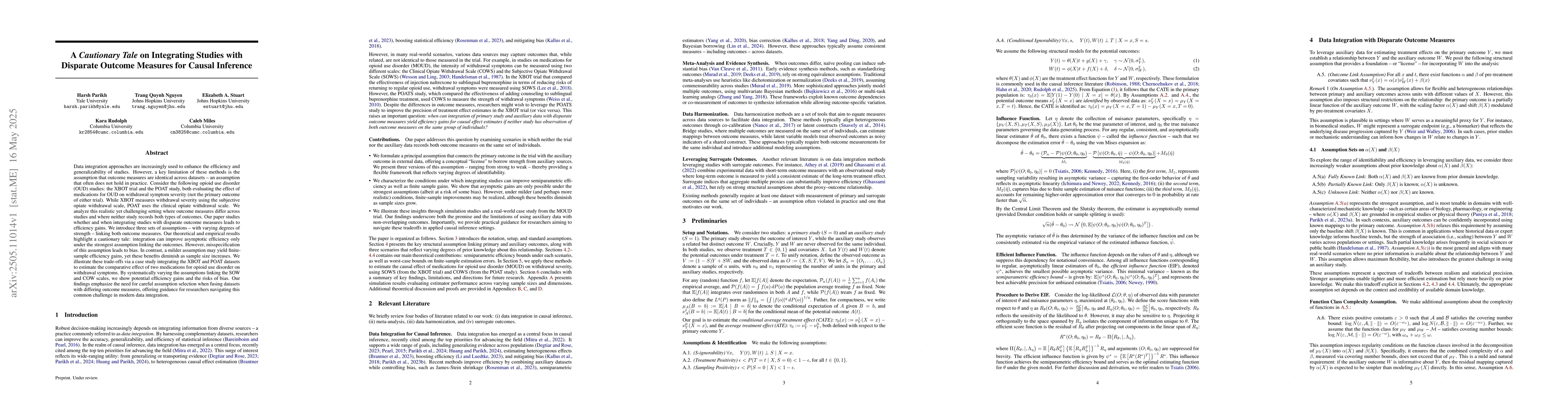This work distinguishes itself by systematically examining the trade-offs between different assumption strengths linking disparate outcome measures, providing a nuanced understanding of the challenges and solutions in data integration for causal inference.
