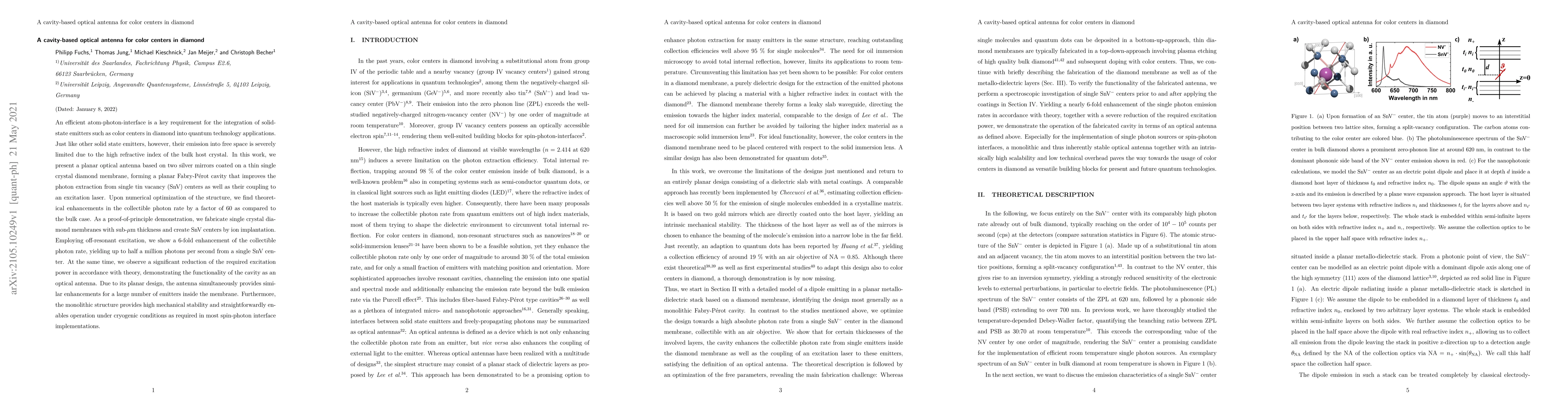 This paper presents a planar optical antenna composed of silver mirrors on a thin diamond membrane to enhance photon extraction from SnV color centers in diamond. Numerical optimization shows a theoretical 60-fold increase in collectible photon rate, with experimental results showing a 6-fold enhancement and reduced excitation power, demonstrating the antenna's effectiveness for quantum technology applications.